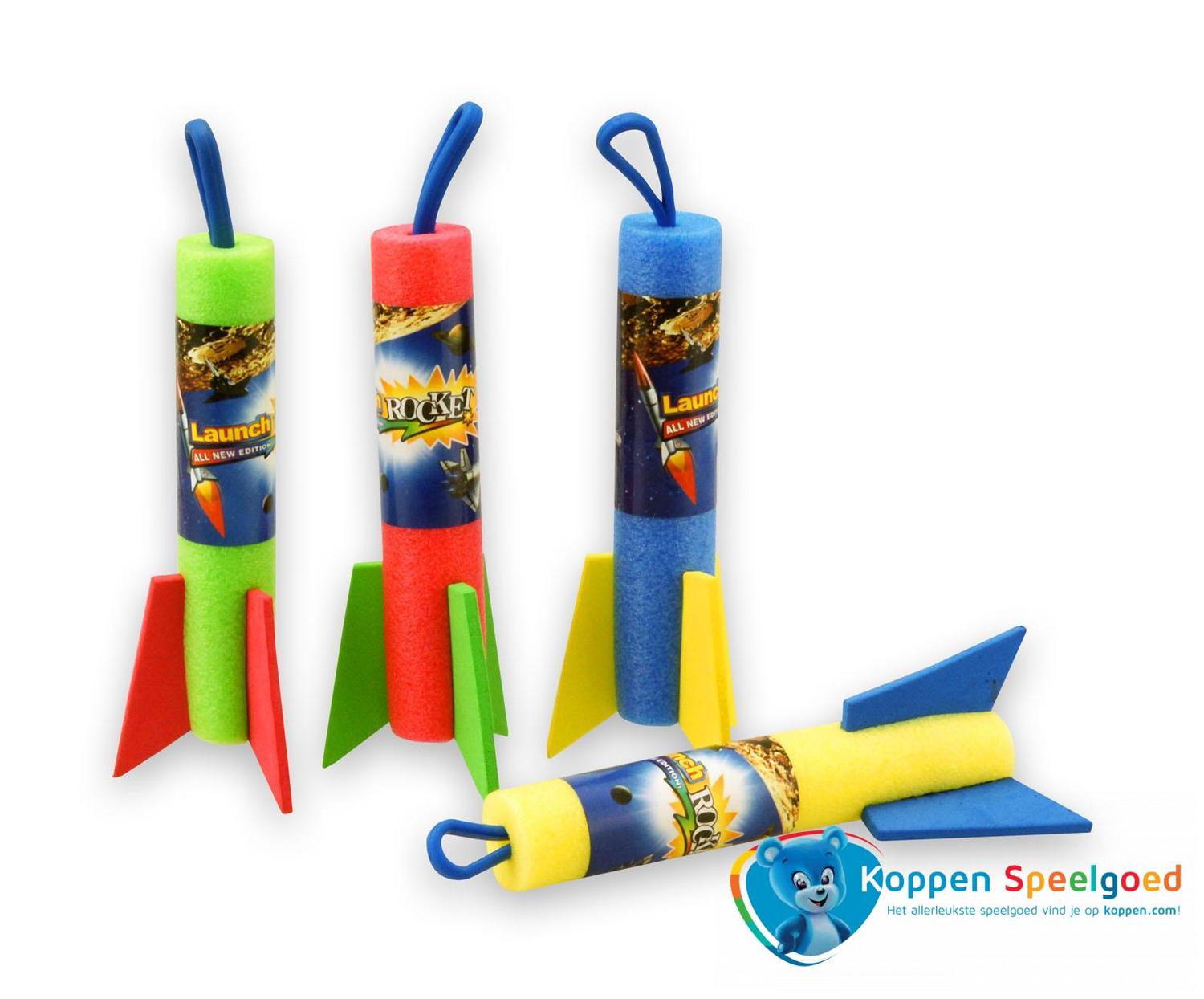 Afschiet raket met elastiek. Doe de elastiek om je duim, trek de raket naar achteren en schiet hem weg. Kan jij hem verder als je vriendjes schieten? De raket is van foam, dus zacht van materiaal. De verschillende kleuren worden door elkaar geleverd. Geschikt voor kinderen vanaf drie jaar.