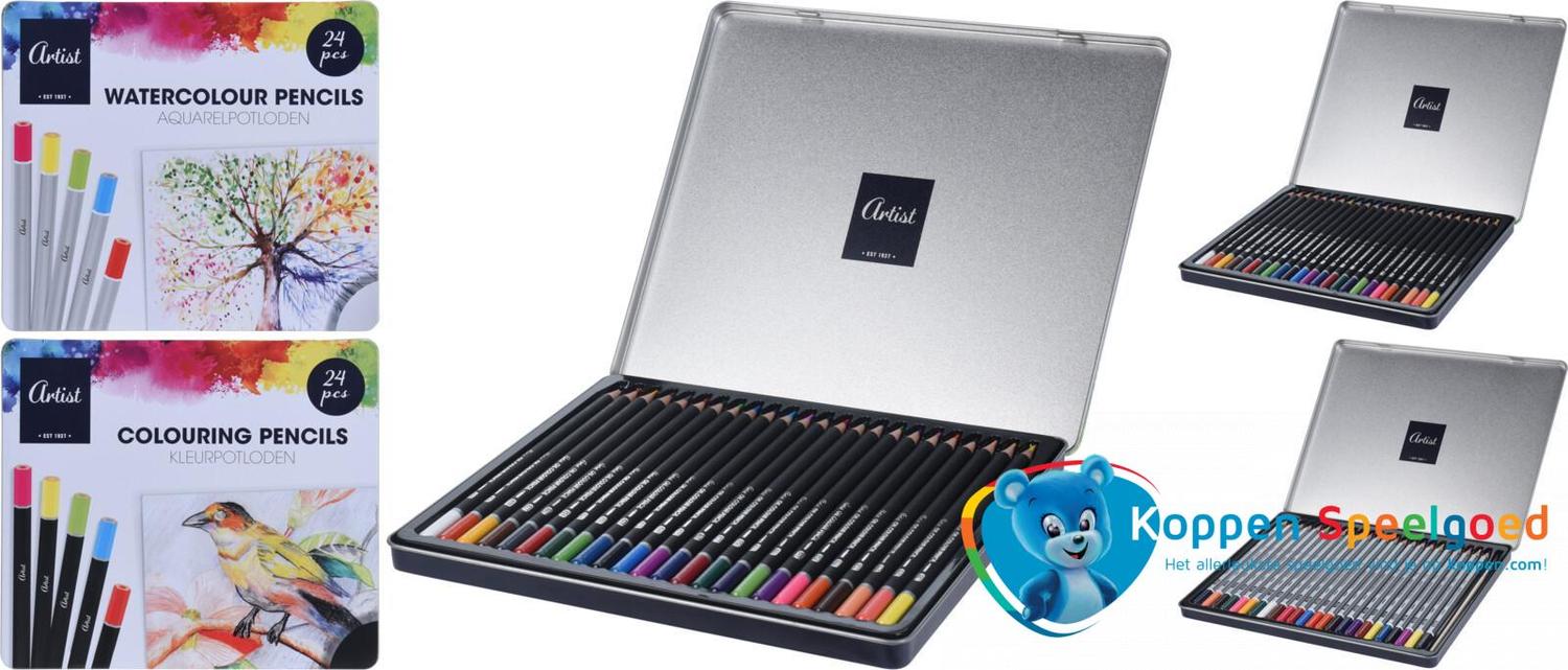 Mooi, stevig bewaarblik met aquarel- of gewone potloden, 24 stuks. Mooie kwaliteit aquarelpotloden of dito kleurpotloden!