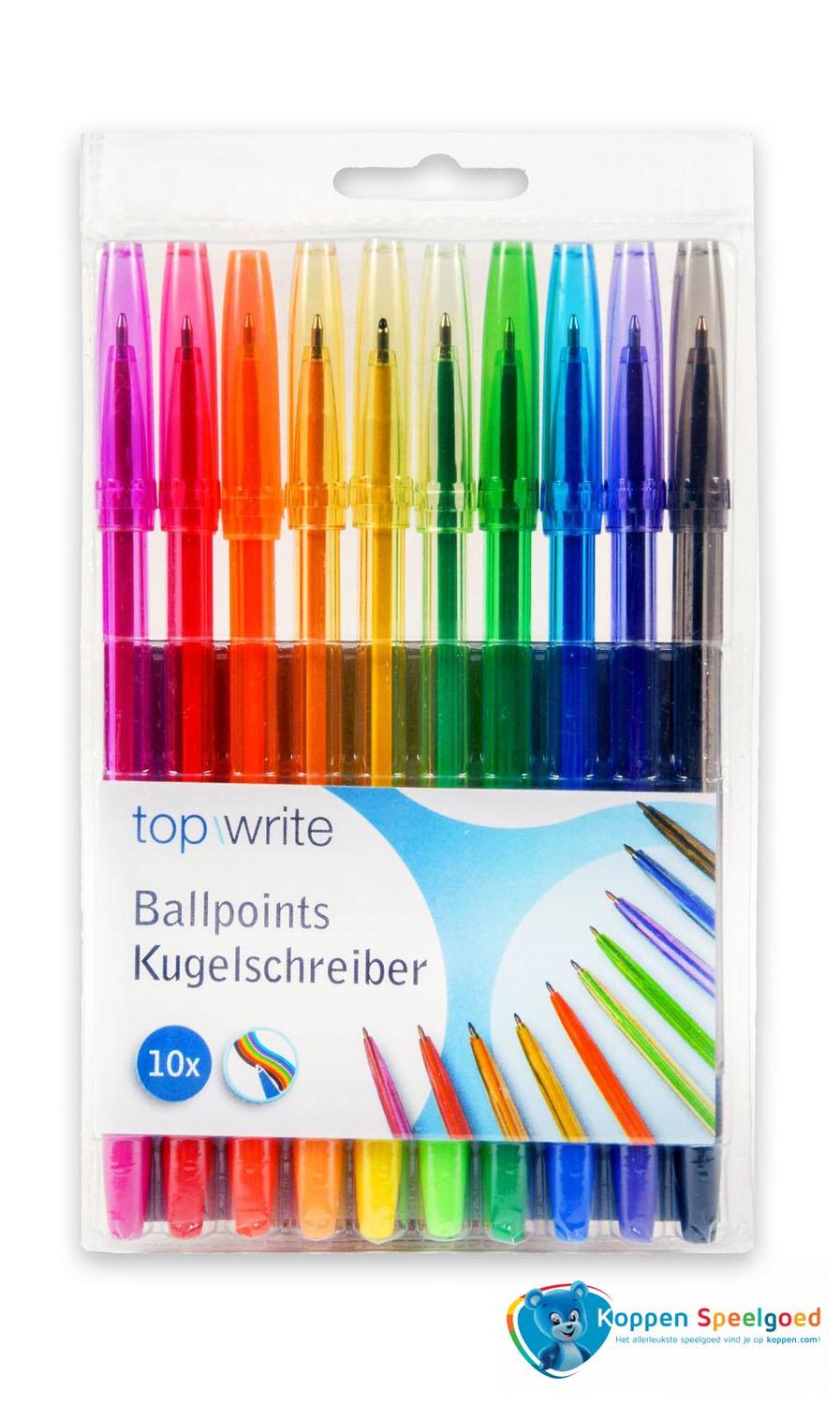 Balpennen regenboog, set à 10 stuks. De schrijfwaren worden geleverd in handig opbergzakje. Geschikt voor kinderen vanaf drie jaar. Door het gebruik van verschillende kleurtjes, kunnen kinderen sneller iets onthouden.