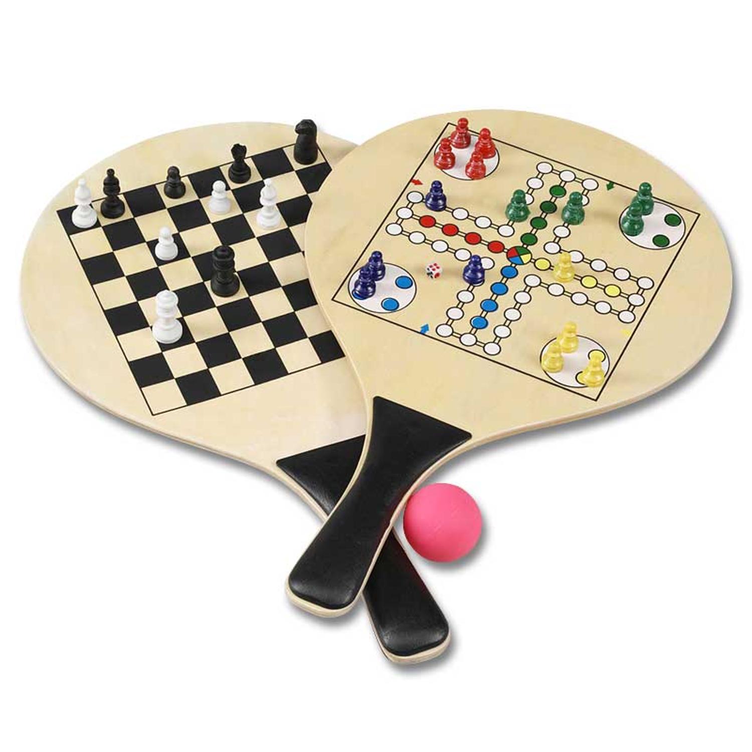 Beachball set met spel, hout. Ga je op vakantie of naar het strand en is er weinig ruimte in de auto? Deze beachball set is uitgerust met verschillende spellen. Speel een potje mens-erger-je-niet of schaken. Dit houten speelgoed is geschikt voor kinderen vanaf drie jaar.