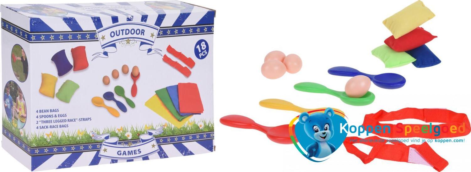 Mooie set met 4 buitenspellen. Met 4 kleurige zakjes gevuld met bonenzaden, 4 lepels met eieren voor het eierlopen, banden om een 'driebenig monster' te maken van jou en een vriendje, en 4 kleurige zakken voor het zaklopen.