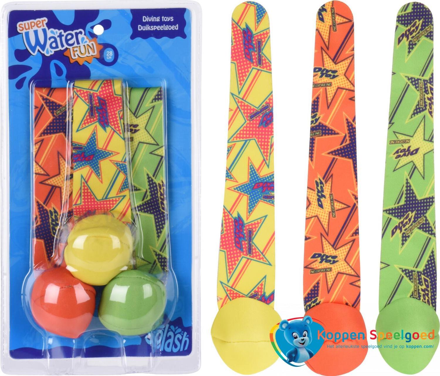 Gooi deze duikballetjes in het water en probeer ze weer op te duiken! Er zitten er drie in de verpakking. Ieder balletje is verzwaard en heeft een staart van ongeveer 20 cm.