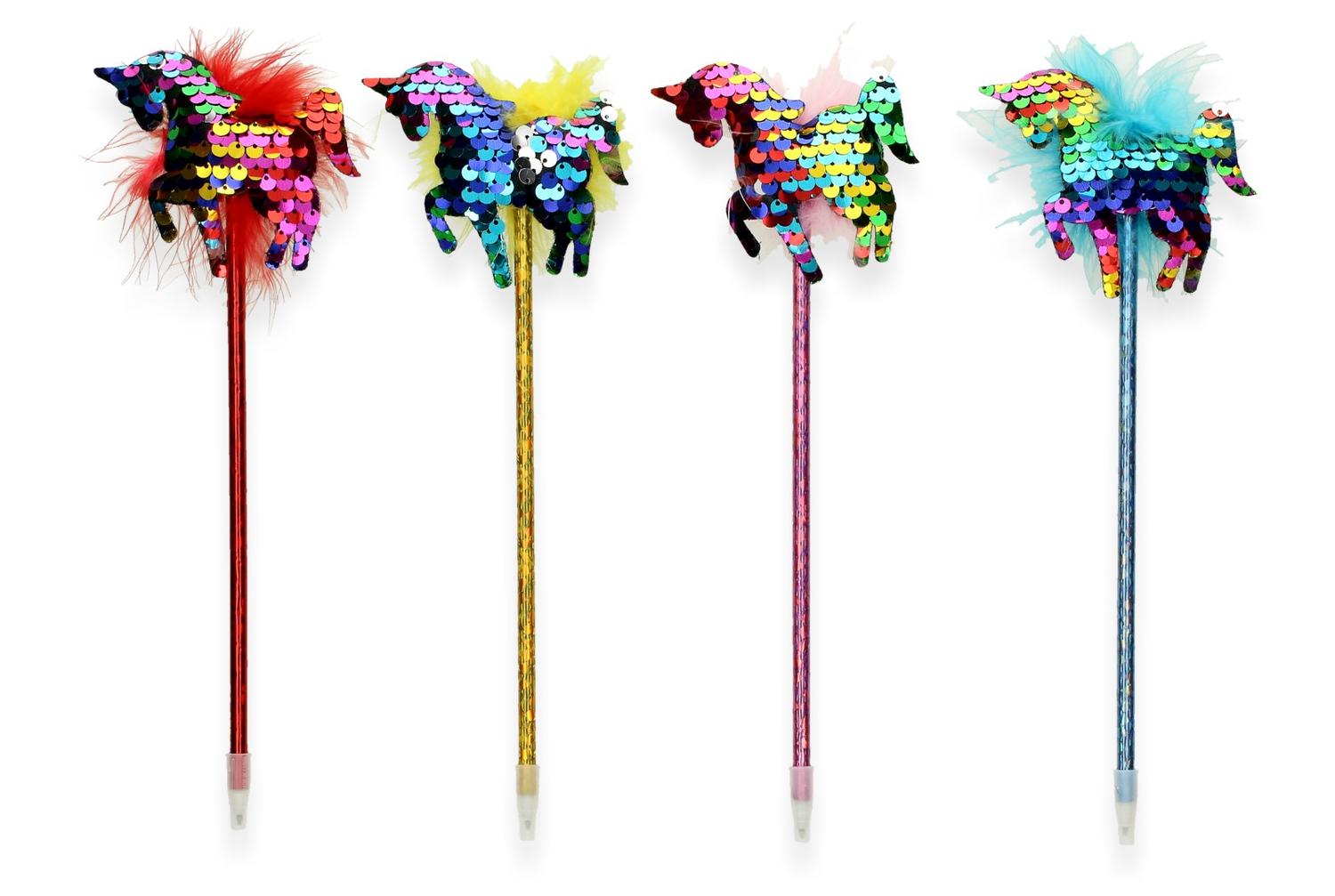 Eenhoorn balpen. Een pen met bovenop een eenhoorn. De eenhoorn is aan de ene kant voorzien van kleurrijke pailletten en de andere kant heeft een toef zachte pluizen.