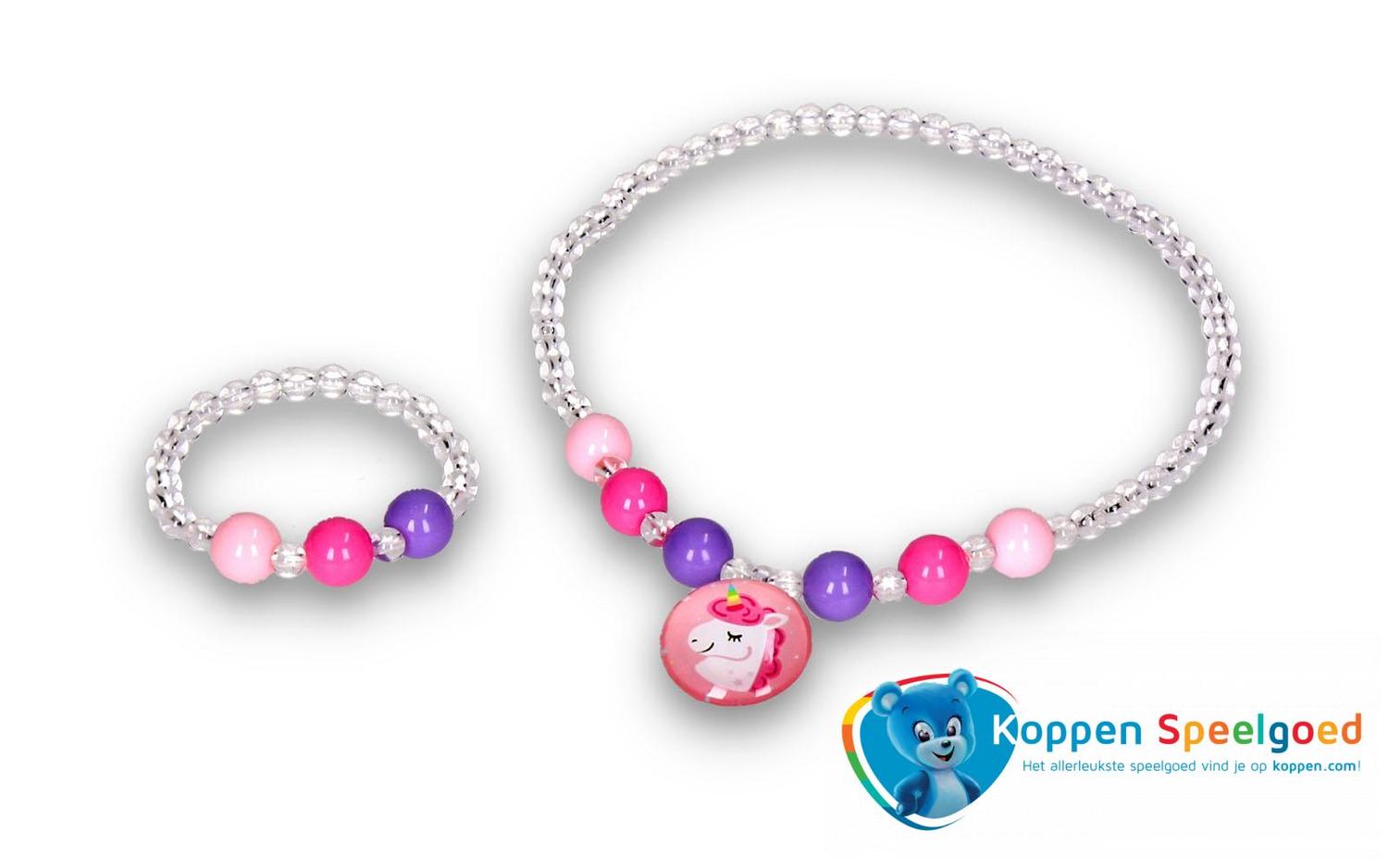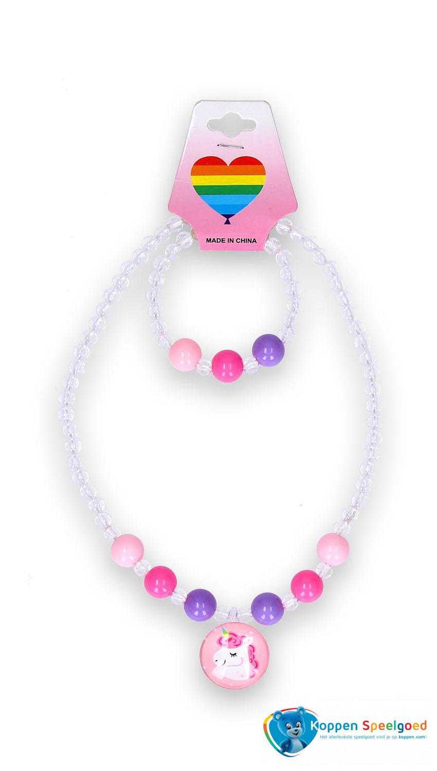 Eenhoorn halsketting en armband. Een setje met een ketting en armband van kralen. Aan de ketting hangt een bedeltje van een eenhoorn (of unicorn). Beide zijn elastisch en dus passen ze altijd. Geschikt voor kinderen vanaf drie jaar.