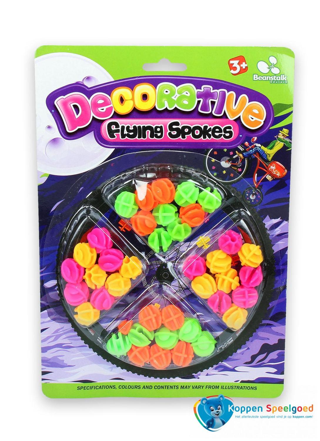 Fiets spaakkralen op kaart. Verschillende kleuren spaakkralen op een kaart. Laat iedereen weten dat jij eraan komt fietsen door de kralen tussen je spaken te klikken. Geschikt voor kinderen vanaf drie jaar.