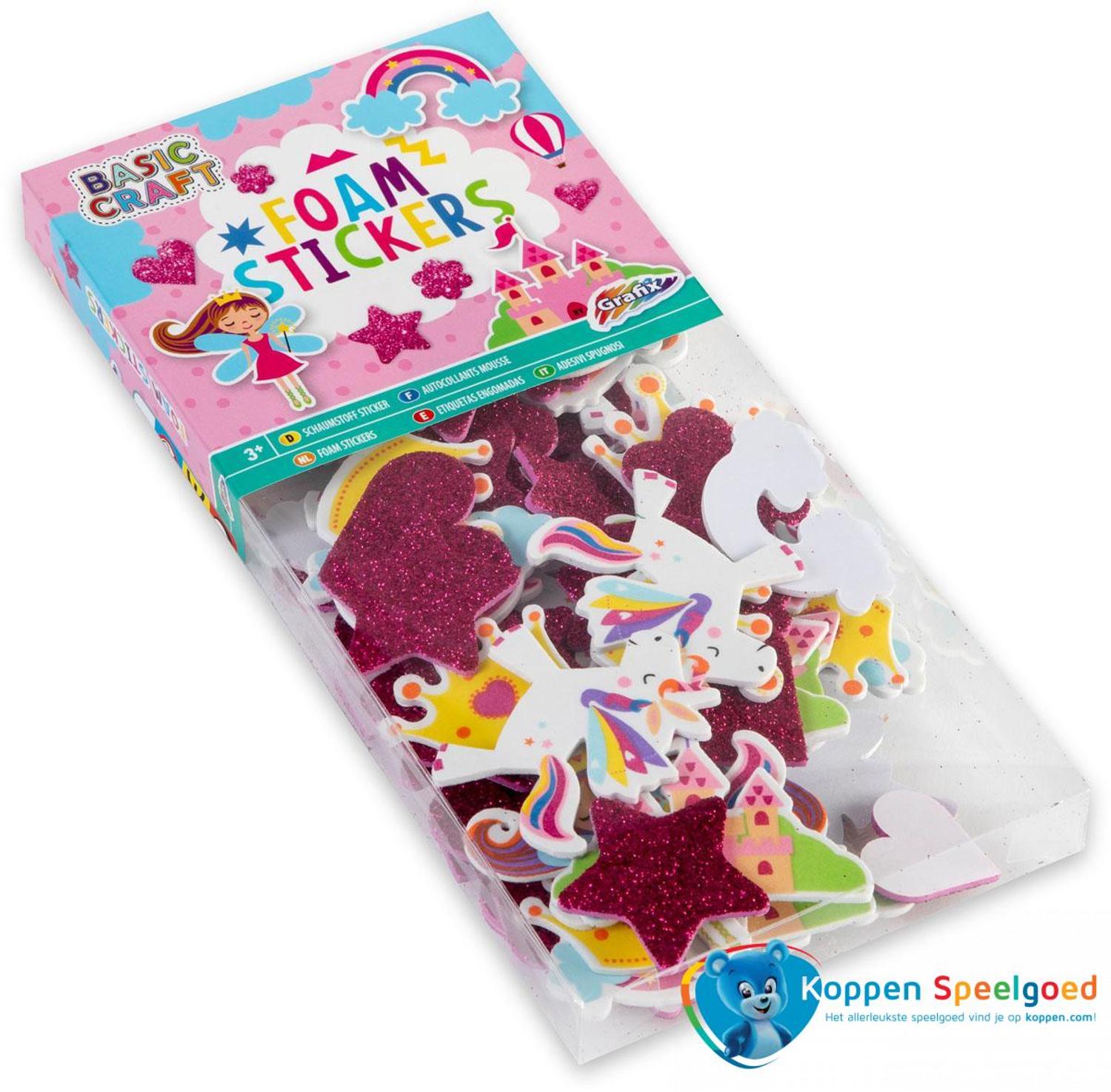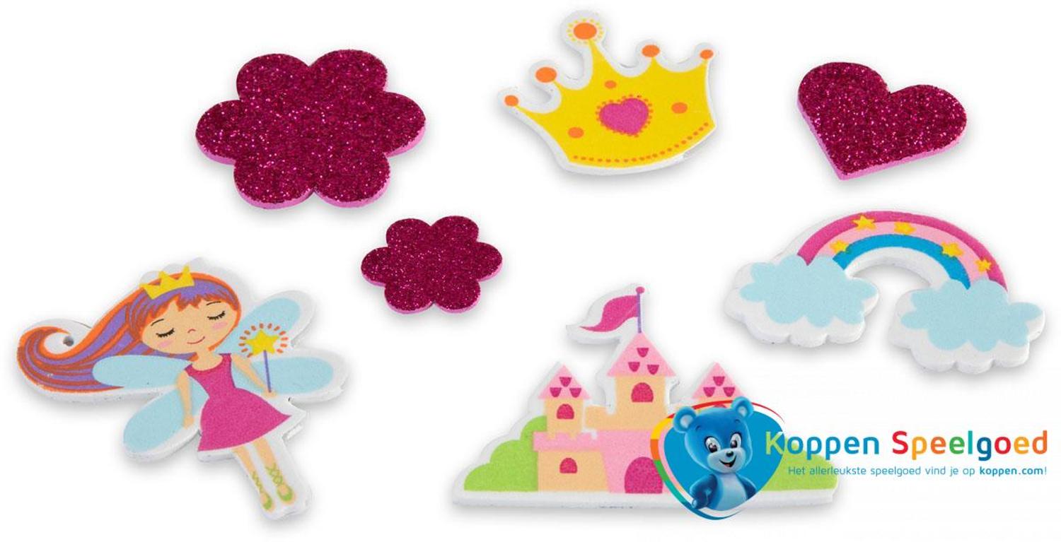 Foam stickers in fantasiethema met regenboog, elfje, kasteel, kroontje, glitters, sterren, hartjes en bloemen.