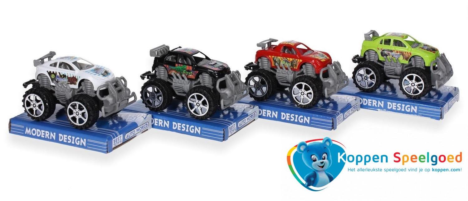 Gekleurde monster truck. Verkrijgbaar in de kleuren geel, wit, blauw en rood. Leuk voor kinderen vanaf drie jaar.
