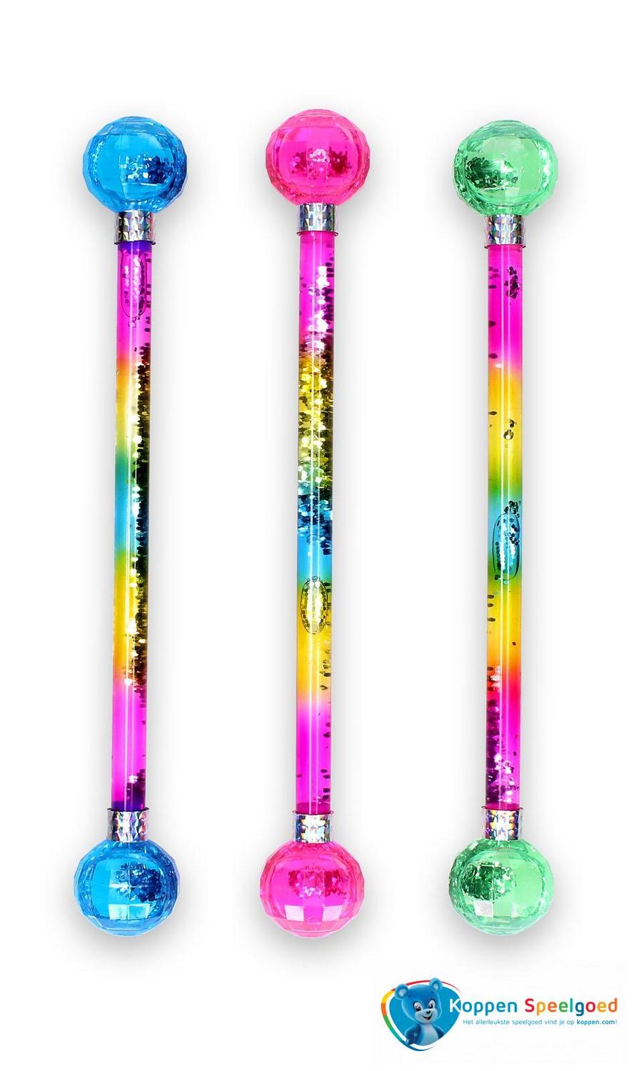 Deze majorette baton heeft alle kleuren van de regenboog. Het uiteinde bevat een gekleurde bol. Draai er mee rond en het geeft een mooi lichteffect.
