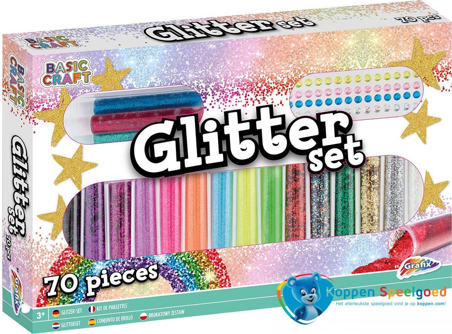 Een glitterset 70-delig met 15 buisjes met glitter, 3 buisjes met glitterpennen en 52 glittertjes.