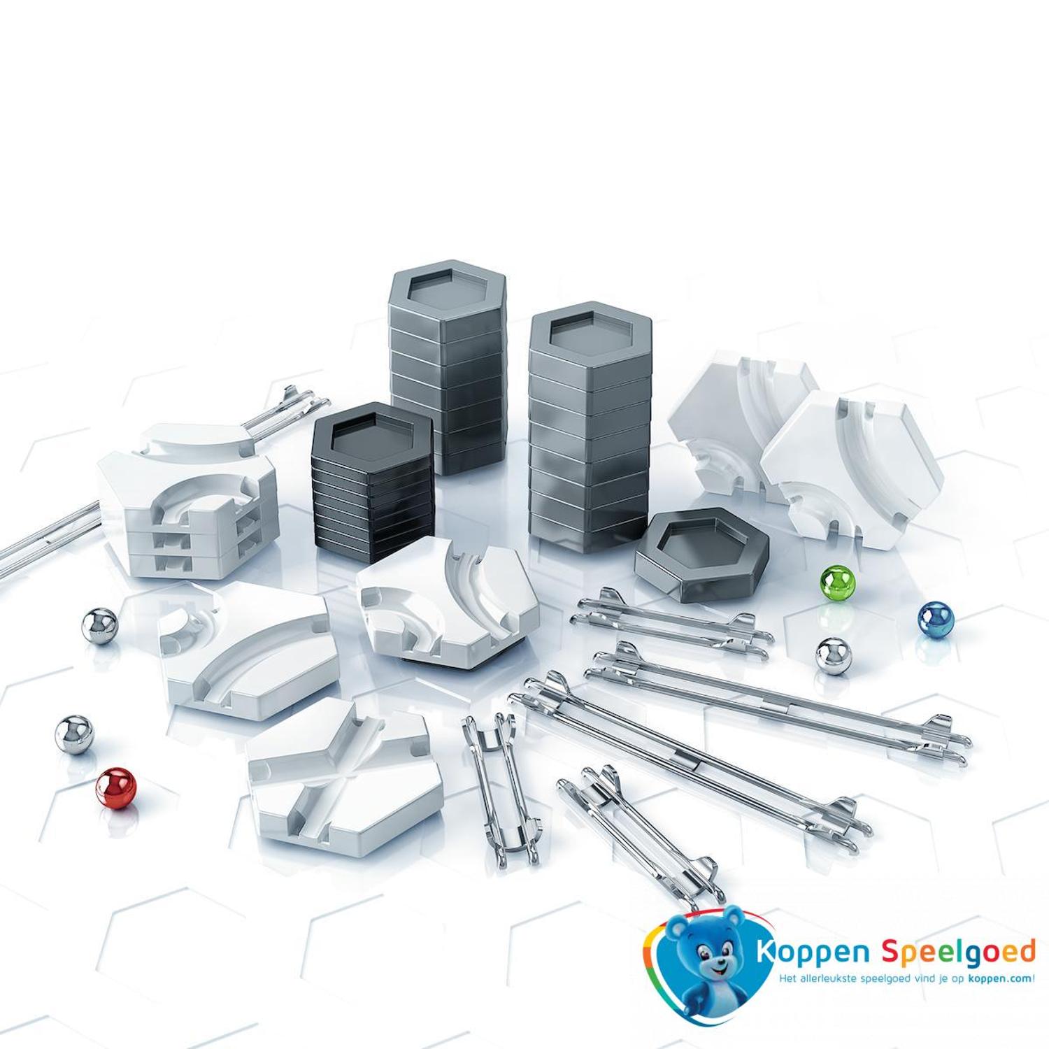 Verleng je banen! Met deze set breng je je kogelbaanwereld naar een nieuw level. Combineer de verticale stukjes, bochten en rails met jouw GraviTrax® Starter Set voor nog meer actie in de kogelbaan. Hoe lang kun jij je kogels laten rollen? Verbreek je je persoonlijke record?