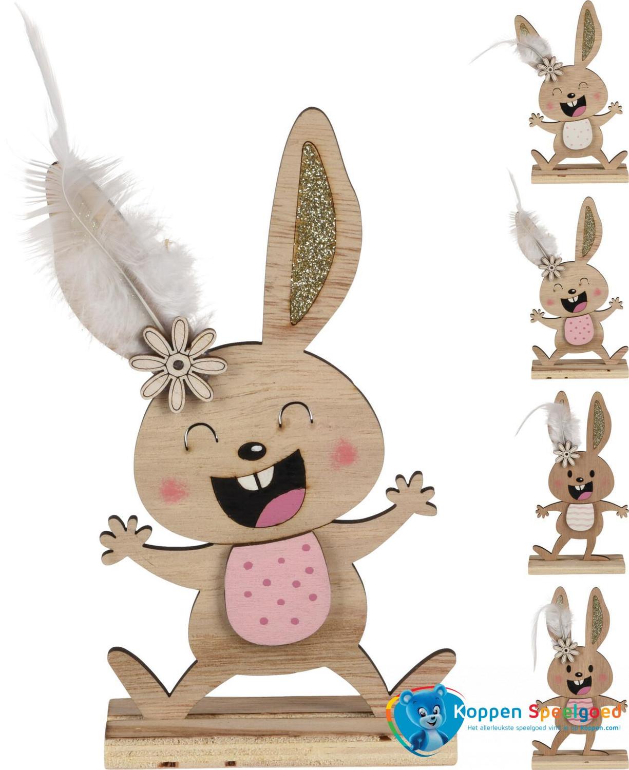Een mooi gedecoreerd haasje met een veer als pluim. Leuk als decoratie met Pasen!