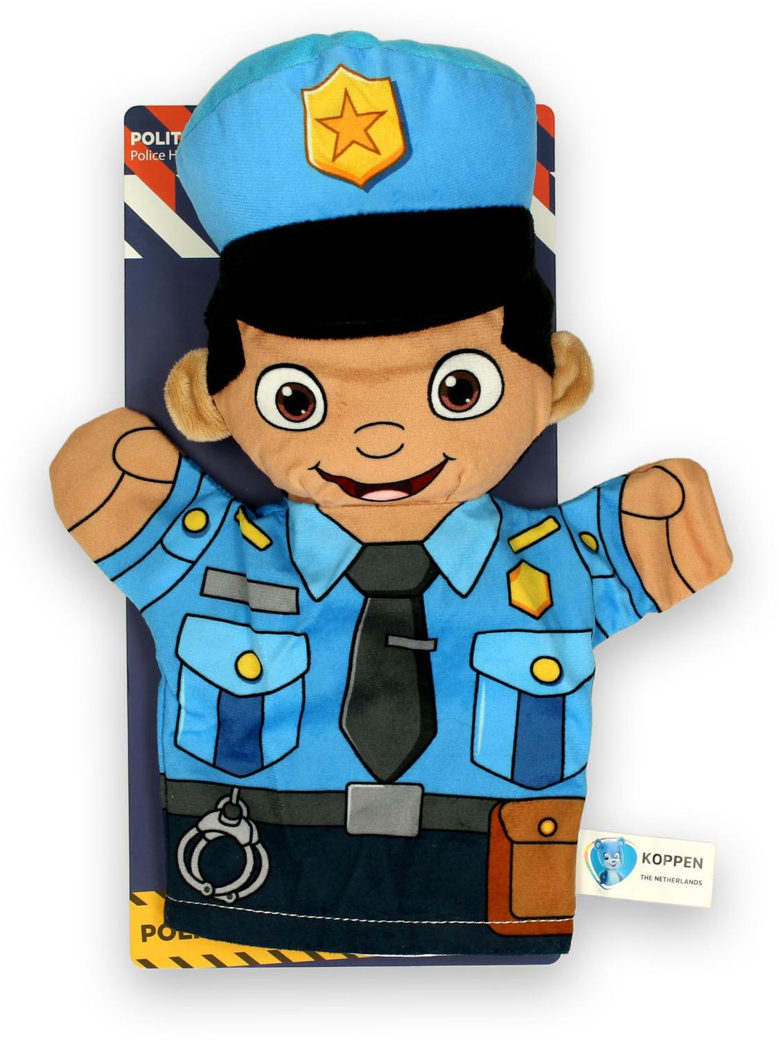 Je hand kan aan de onderkant in de pop en met je vingers kan je de armpjes en het hoofd laten bewegen. Super leuk om voor kinderen een spannend verhaal uit te beelden over het leven van de politie!