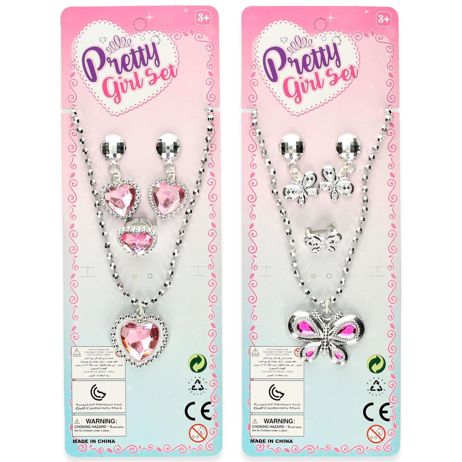 Juwelenset is een speelse sieradenset voor kinderen, bestaande uit een ketting en oorbellen in glinsterende zilverkleur met vrolijke accenten. Verkrijgbaar in 2 varianten: met roze hartjes of met bloem- en vlinderdesign. Deze sets zijn licht van gewicht, veilig voor kinderen vanaf 3 jaar en leuk voor rollenspel, verkleedpartijen of als klein cadeautje.