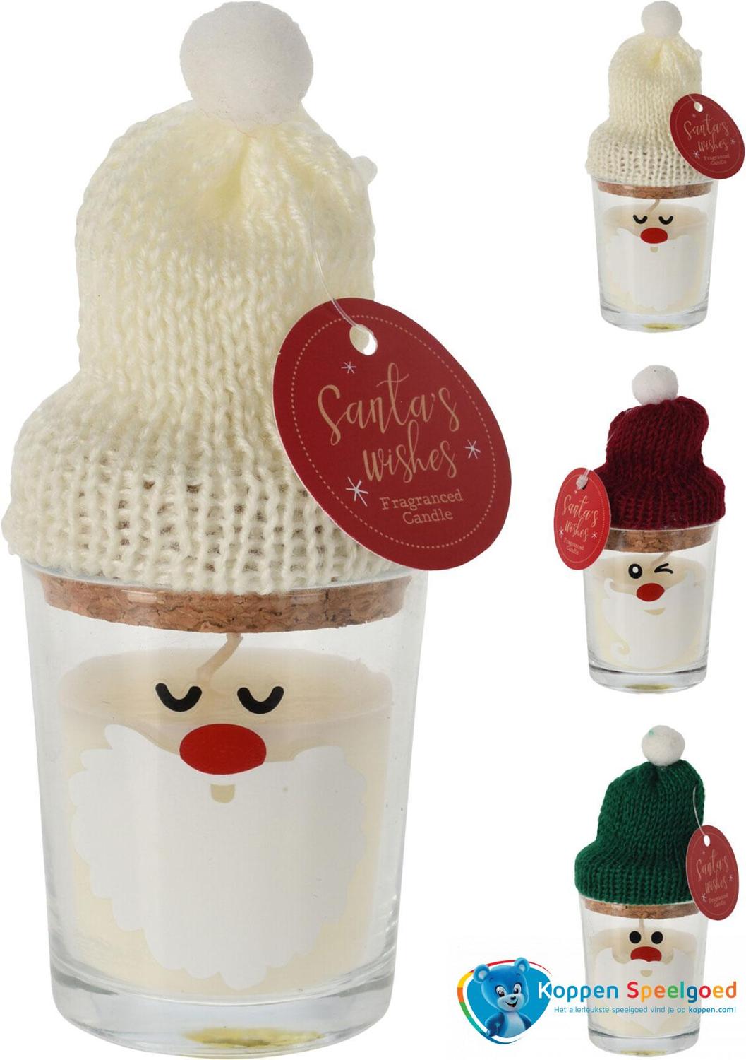 Leuke als kerstdecoratie. Een kaars in een glas met een muts. Er zijn diverse varianten. Deze worden door elkaar geleverd. De prijs is per stuk.