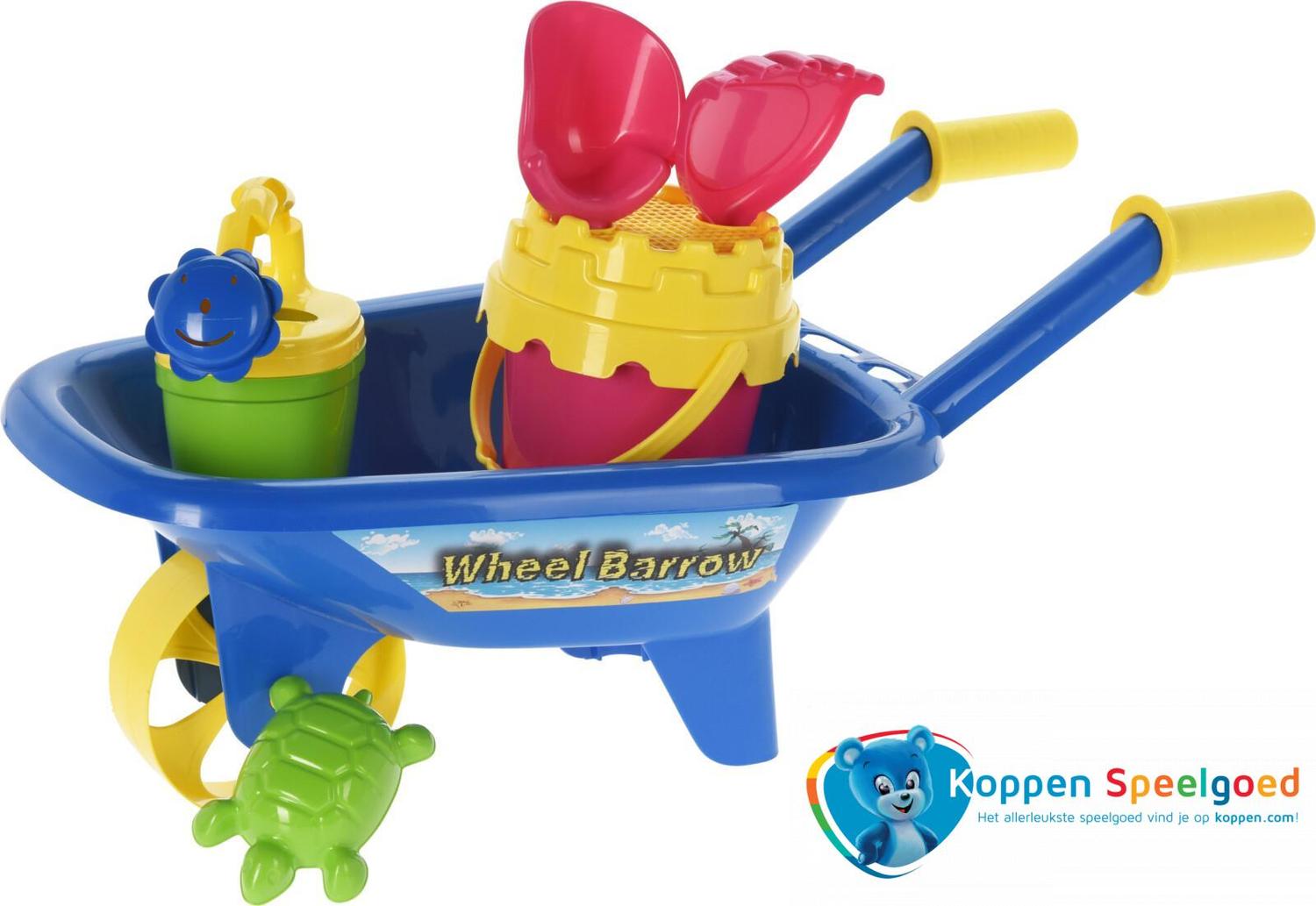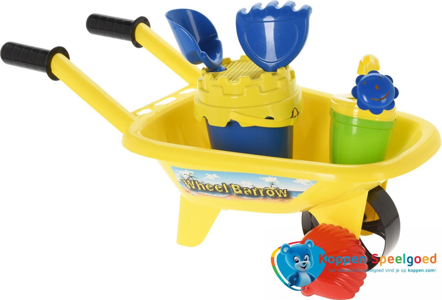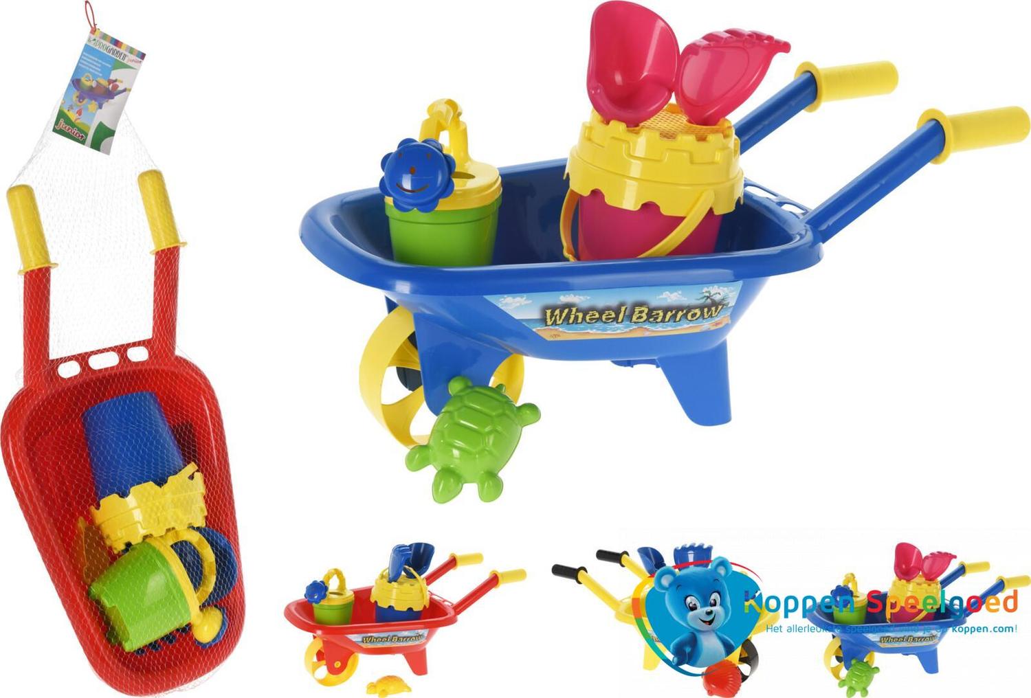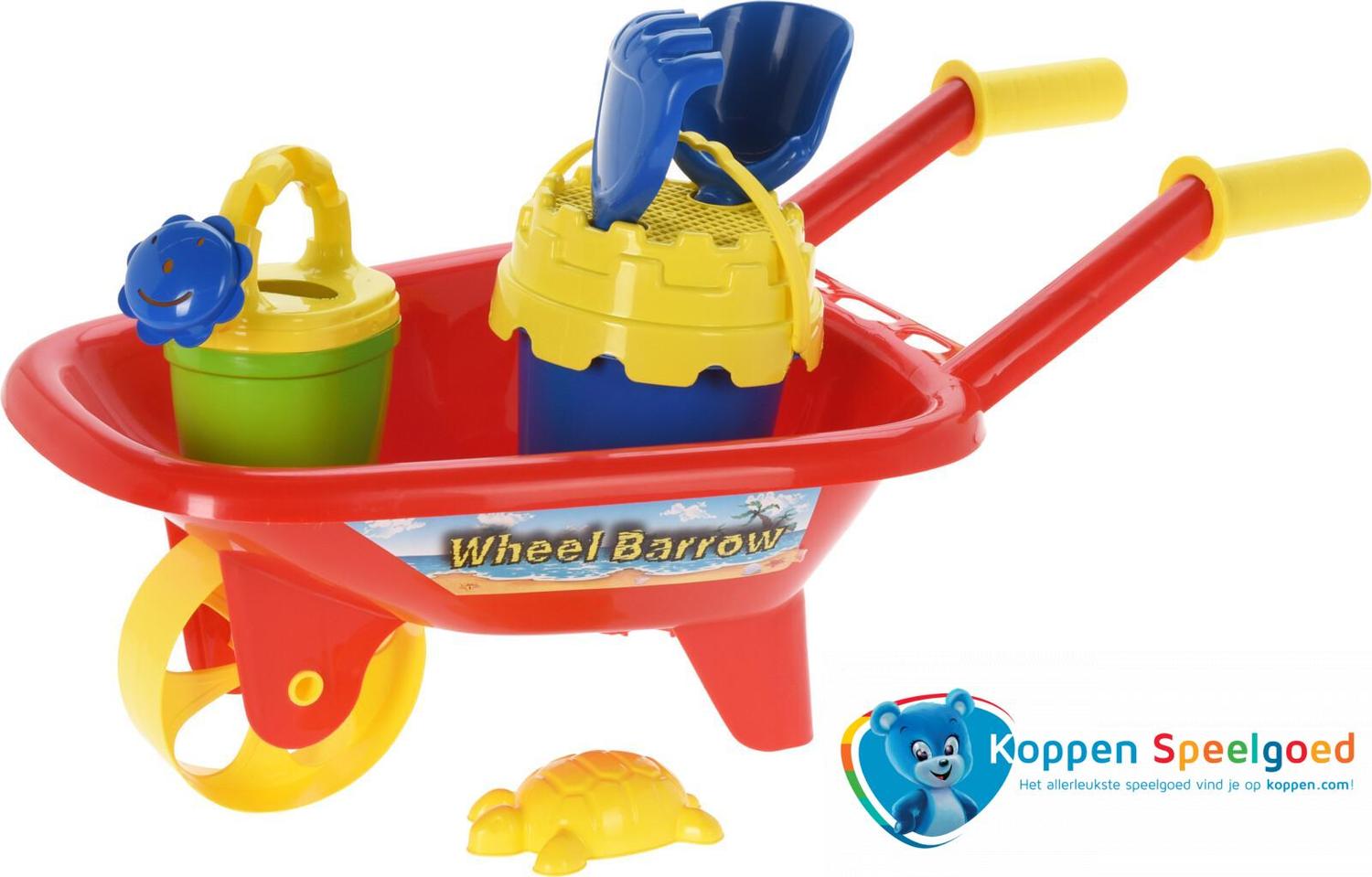 Kinder kruiwagen gevuld met een emmer, zeef, hark, schep en gieter.