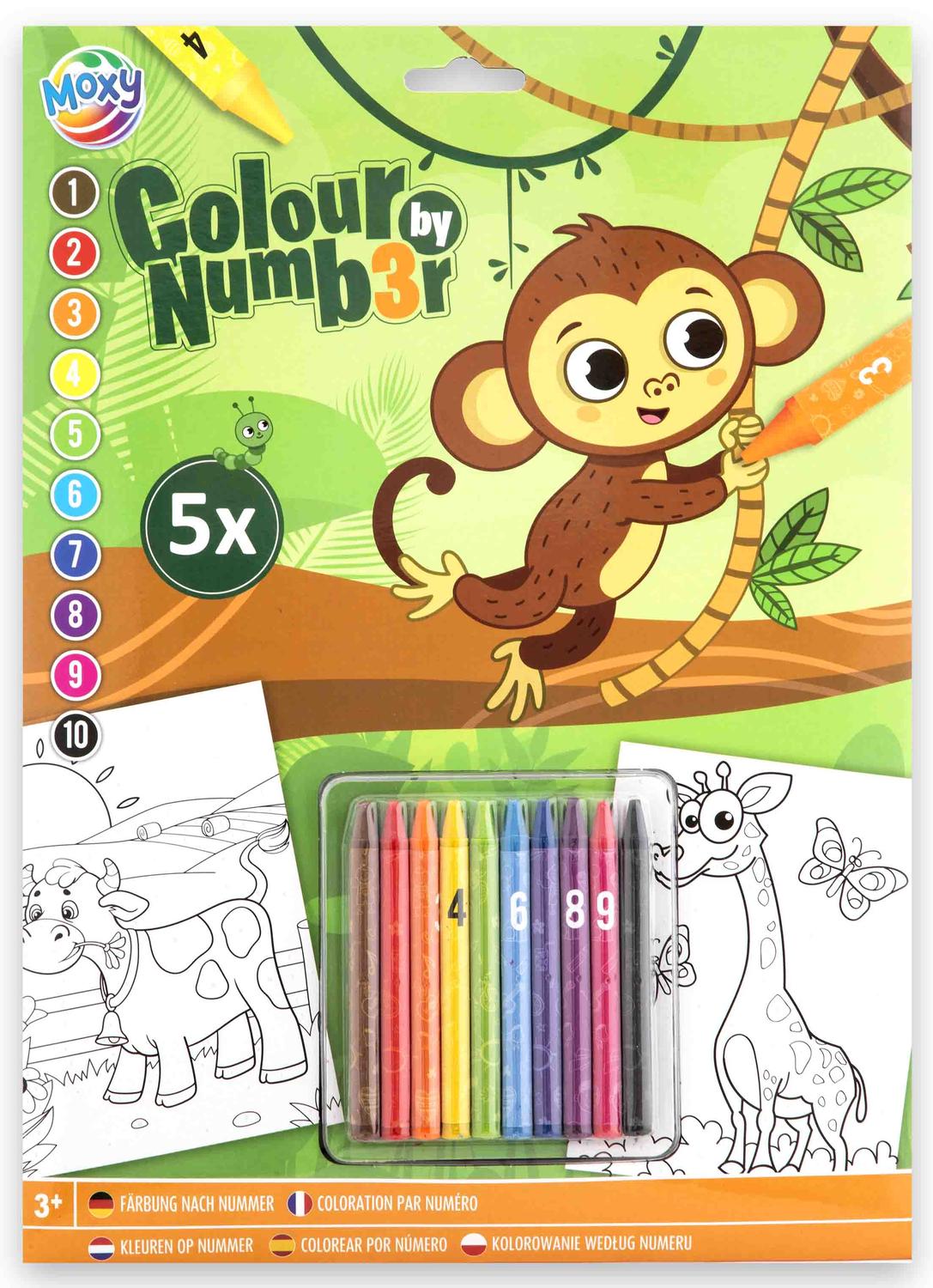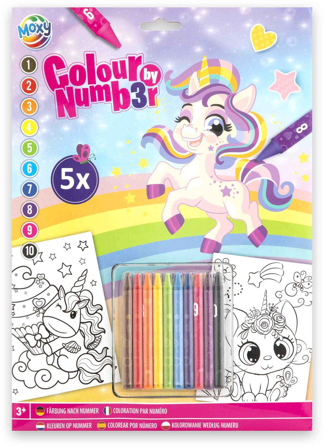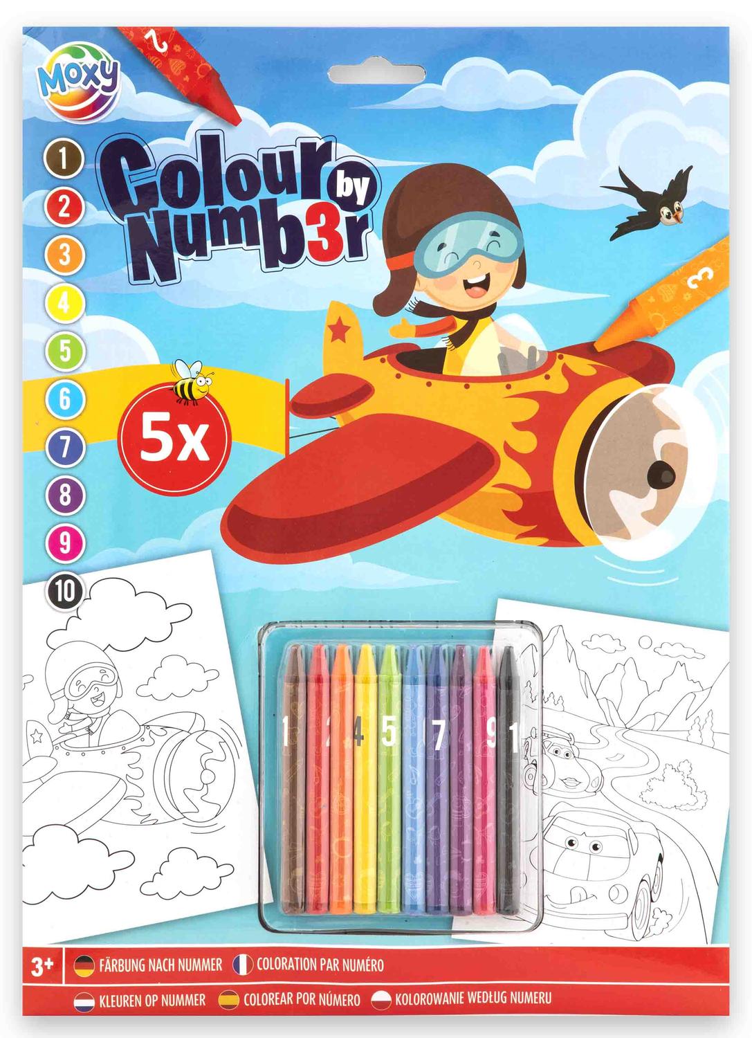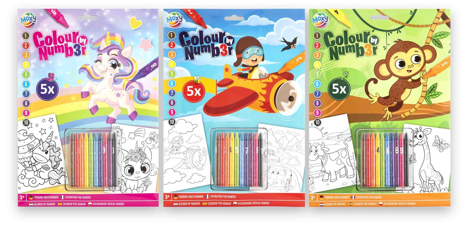 Kleur de voorgetekende afbeeldingen in met de meegeleverde kleurpotloden. De verpakking bevat 5 afbeeldingen en 10 kleurpotloden.