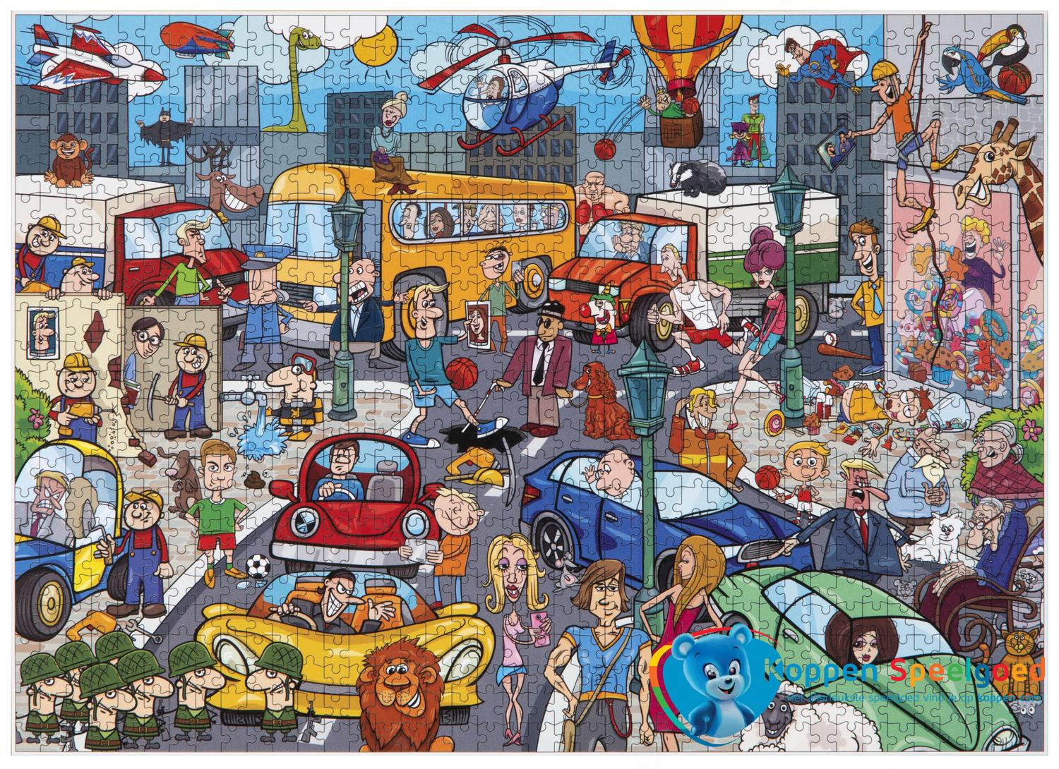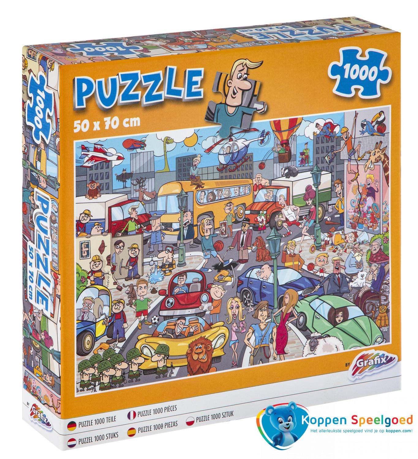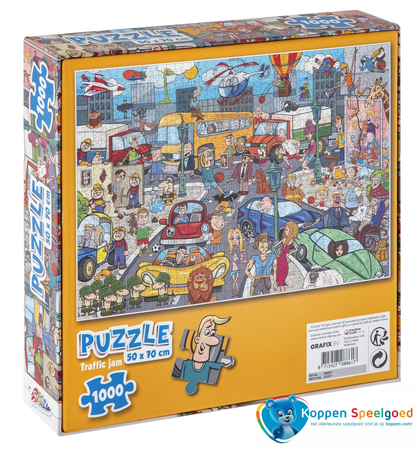 Puzzel voor gevorderden van 1000 stukjes. 50 x 70 cm. Het thema is in het verkeer.