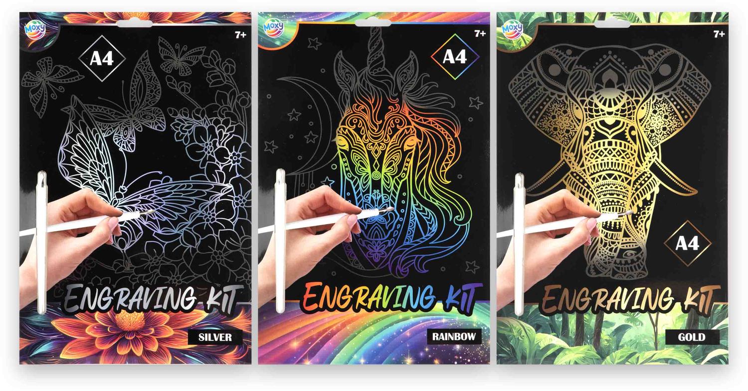 Ontdek Kraskunst: een speelse knutselervaring waarbij verborgen kleuren tevoorschijn komen zodra je krast. Met de kraspen ga je zacht over de donkere laag en onthul je sprankelende tinten onder elke tekening. Geen verf, geen kwasten, geen troep – gewoon pure creativiteit in één simpele beweging.