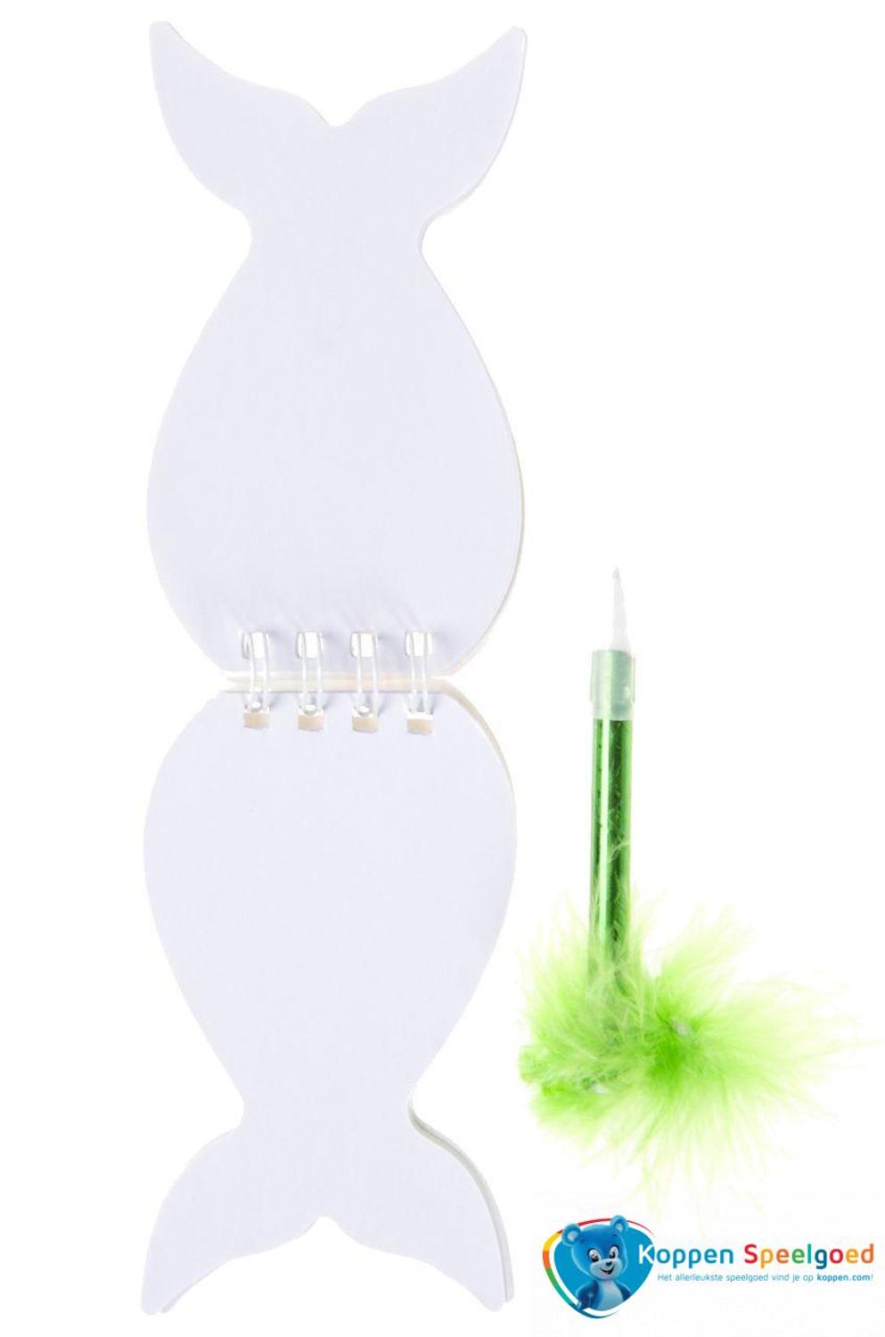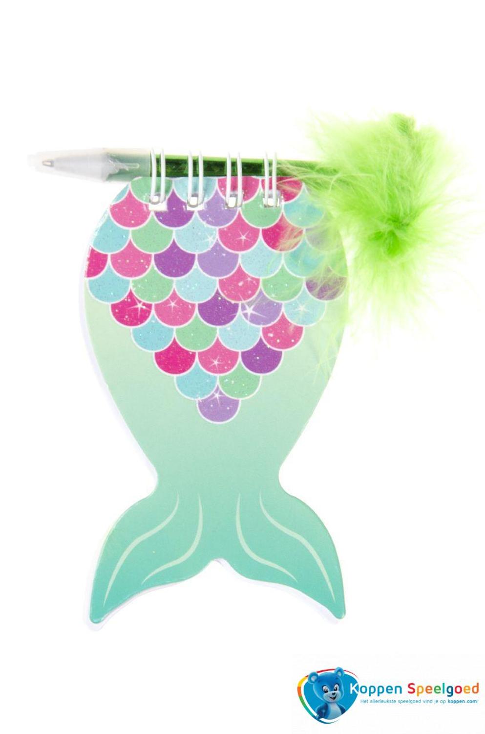 Dit notitieboekje is in de vorm van de staart van een zeemeermin. In de spiraal zit een bijpassende, versierde pen geschoven.