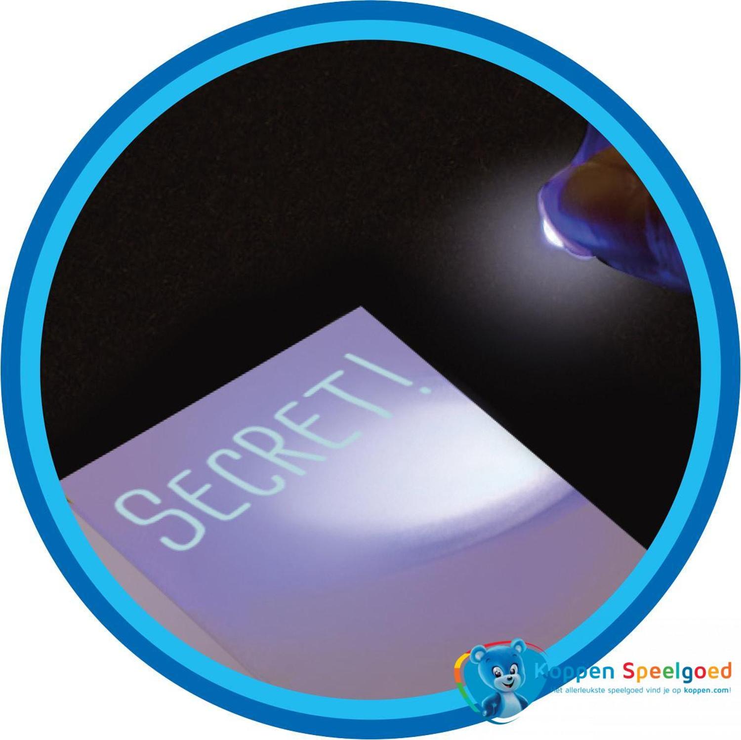 In dit notitieboekje kan je met de speciale pen je geheime berichten schrijven. Schijn erop met de UV-lamp en wat je geschreven hebt, wordt zichtbaar. De batterijen zitten erbij. Leeftijd: 6+