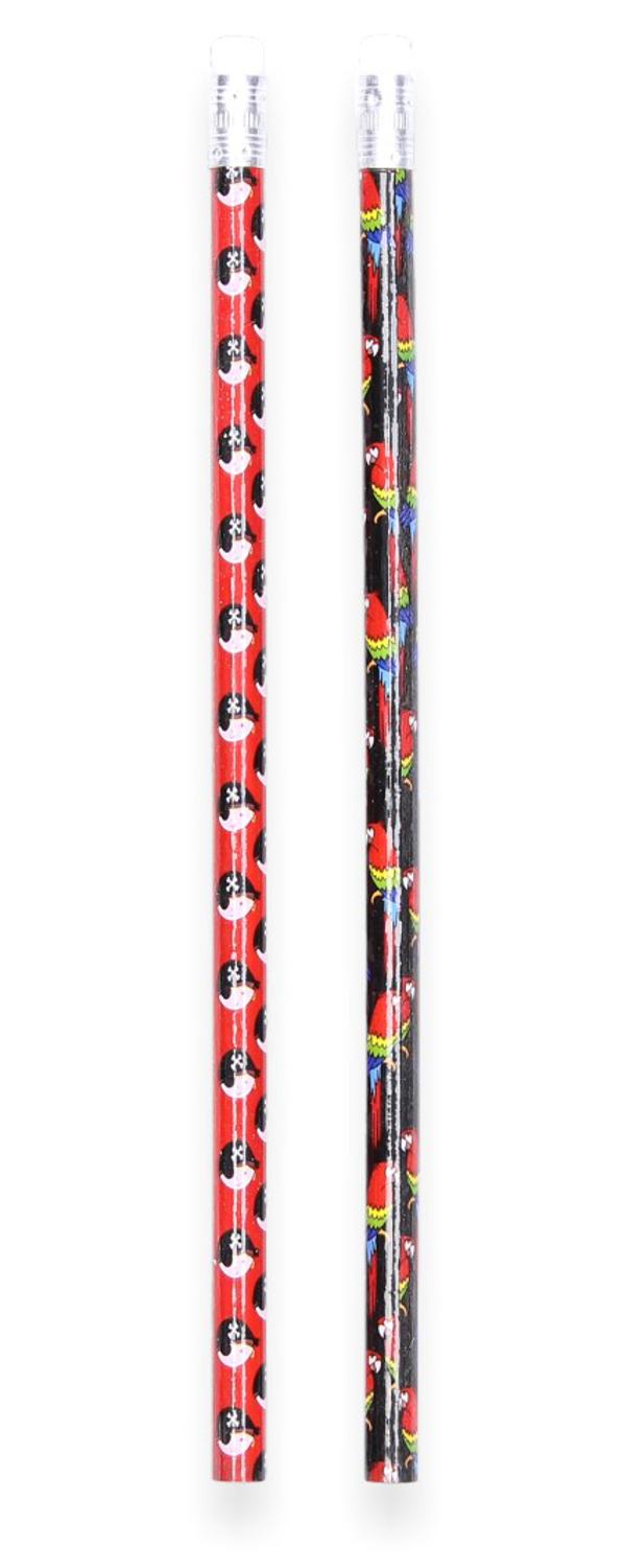 Potlood met een piratengezicht of papegaai. Bovenop het potlood zit een gum.