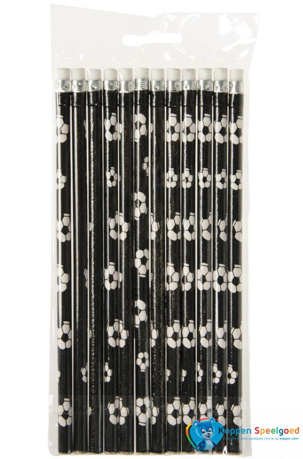 Potlood met zwart/witte opdruk van voetballen rondom en een gum achterop. Prijs is per stuk.