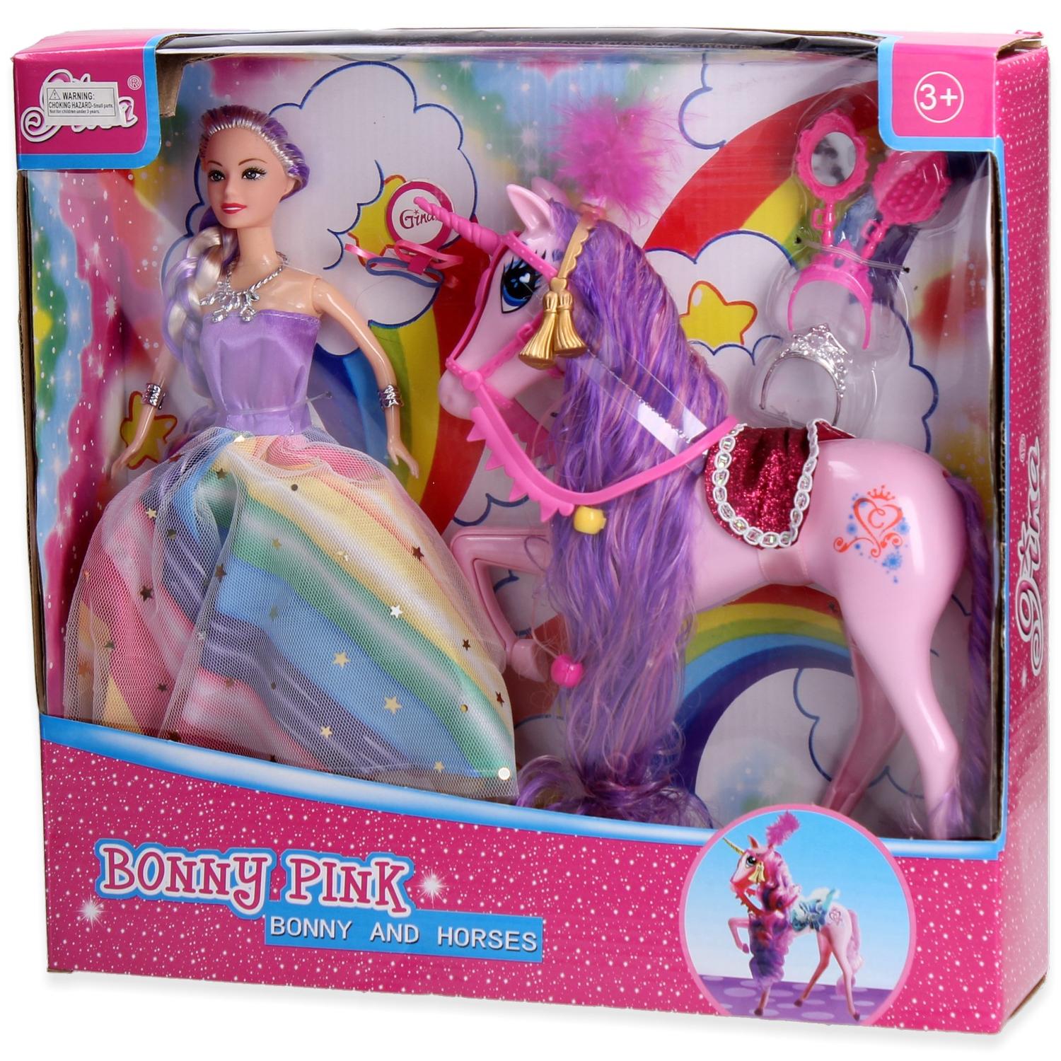 Prinses met paard is een betoverende speelset bestaande uit een stijlvolle prinsessenpop en een prachtig roze paard met lange, paarse manen. Dankzij de kleurrijke regenboogjurk en het sprookjesachtige design stimuleert deze speelset fantasierijk rollenspel en creativiteit. Geschikt voor kinderen vanaf 3 jaar.