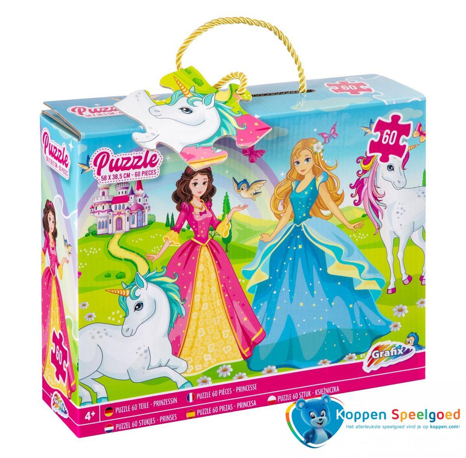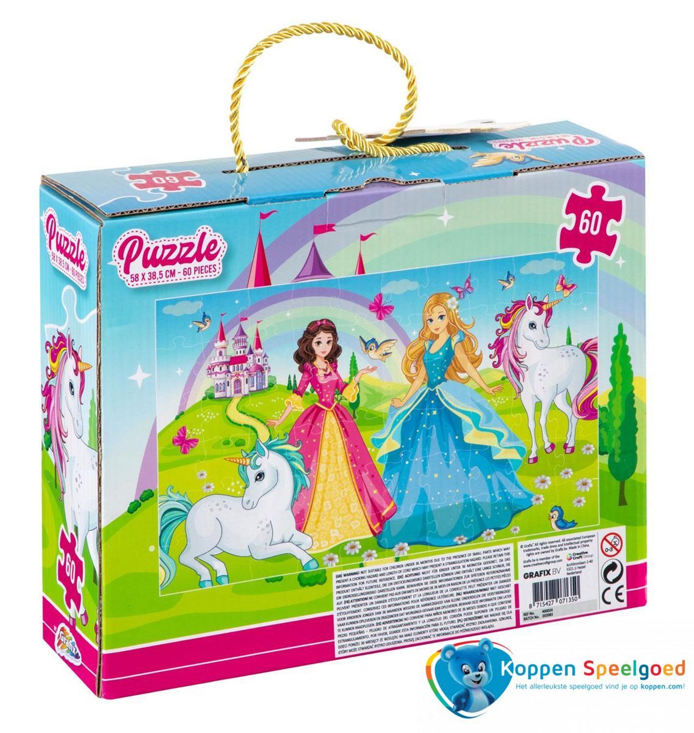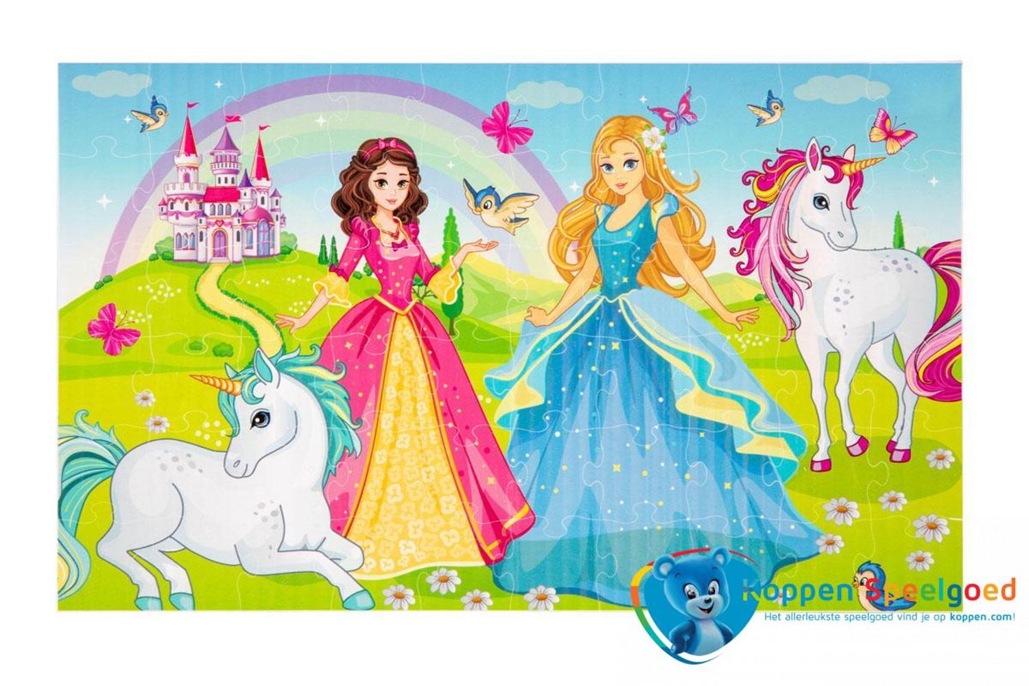 Mooie puzzel van twee prinsessen met eenhoorns in een landschap. De puzzel heeft 60 stukjes en wordt 58 x 38,5 cm groot.