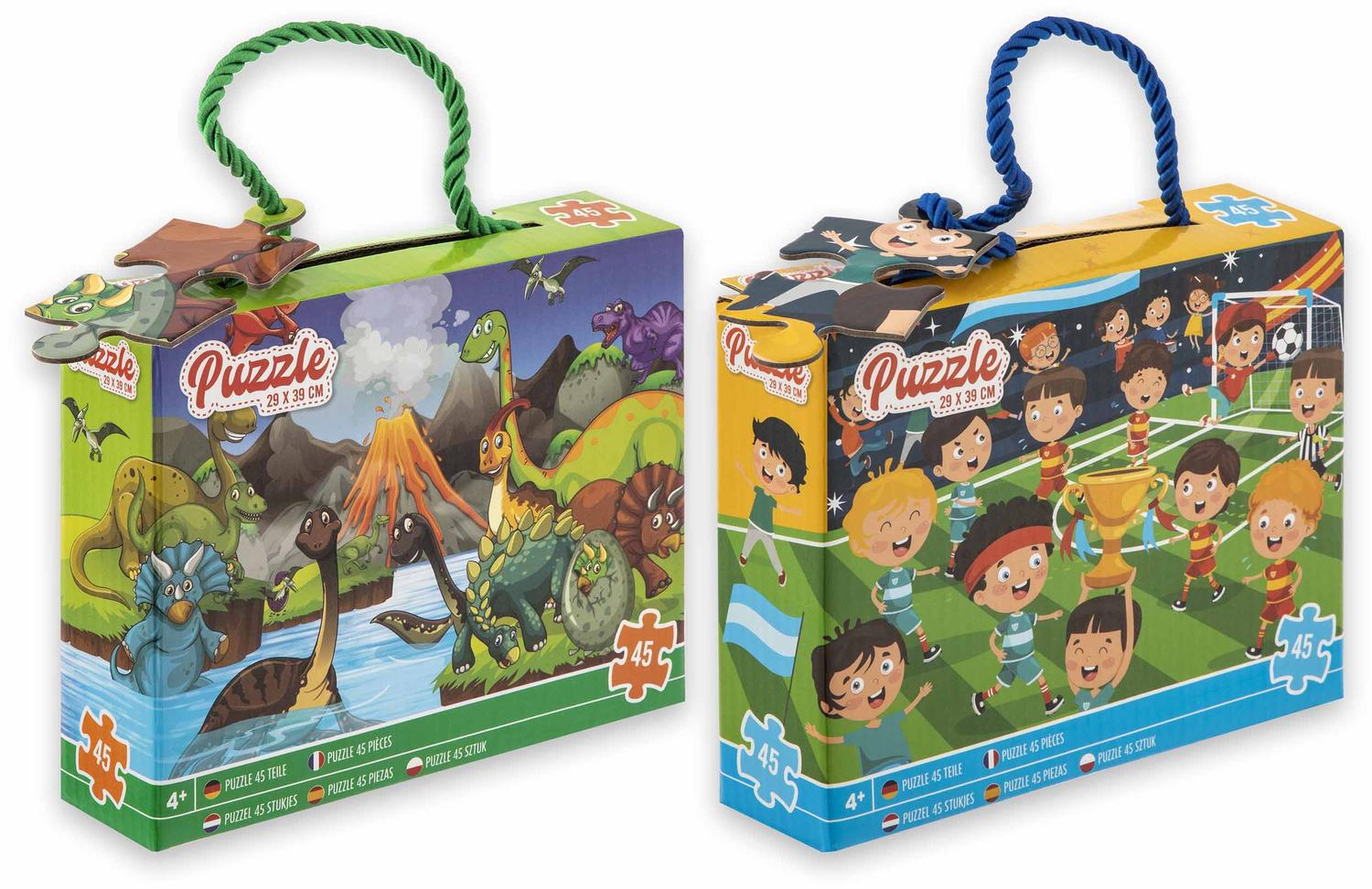 Ontdek spelenderwijs de wereld van dino's of voetbal met deze legpuzzel over dino of voetbal. Deze kleurrijke puzzel met 45 stukjes is perfect voor kinderen die fan zijn van brullende dino’s of van spannende voetbalwedstrijden. Deze puzzel zorgt gegarandeerd voor plezier en uitdaging, het helpt bovendien bij het verbeteren van concentratie, probleemoplossend denken en fijne motoriek.