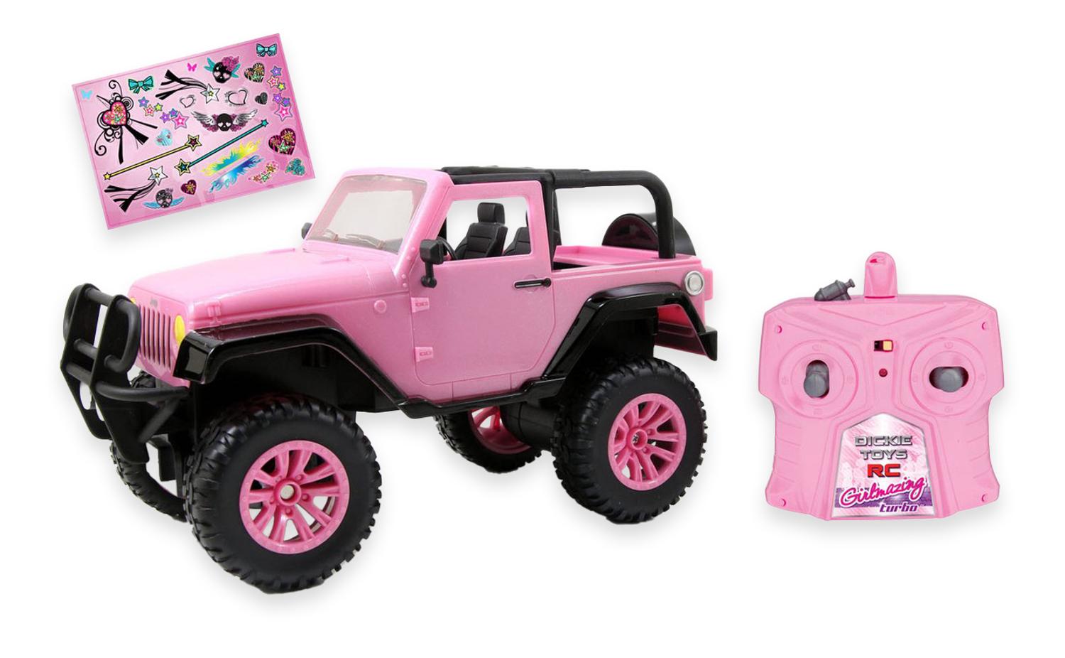 Zin in een offroad-avontuur? Neem plaats en ga op pad: de knalroze Jeep Wrangler van Dickie Toys rijdt moeiteloos over heuvels en dalen en je snel naar je bestemming.