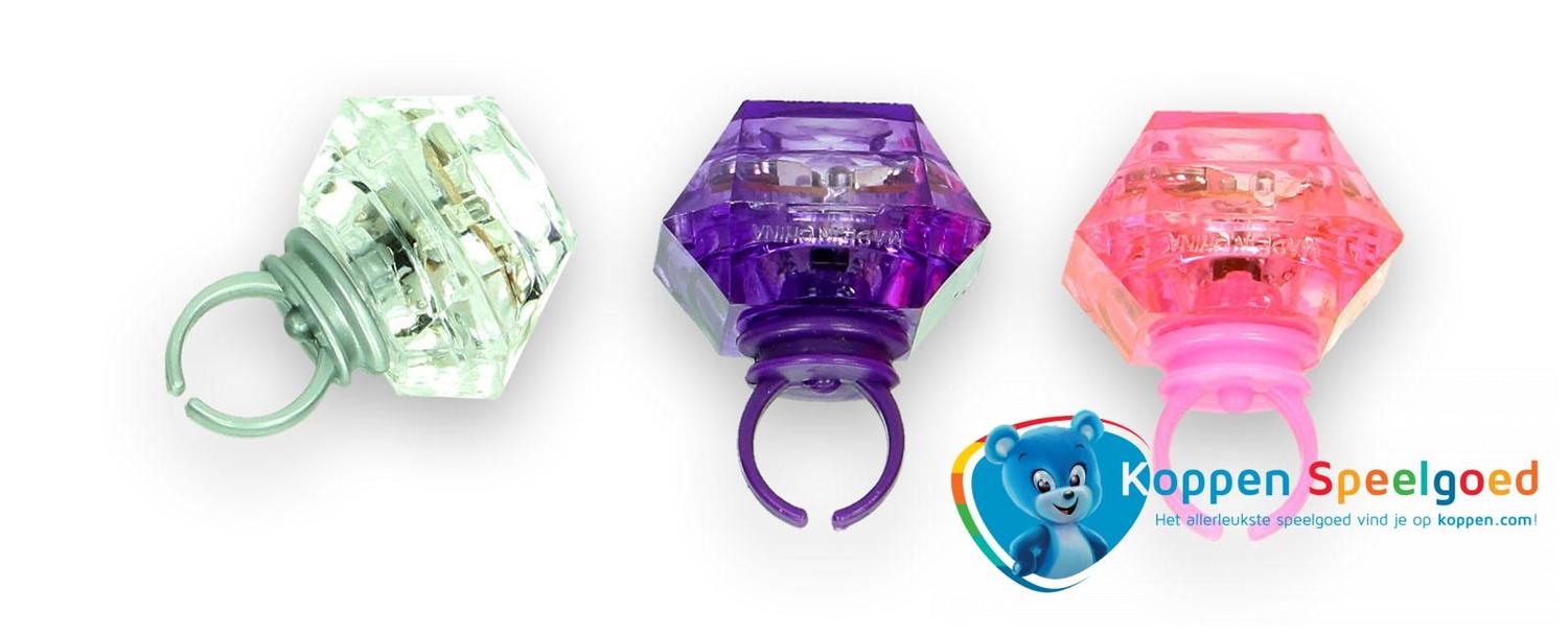 Ring met 3 lichtstanden. Het gedeelte wat om je vinger gaat is rekbaar, dus past makkelijk om je vinger. Doe de ring om je vinger en steel de show door één van de drie verschillende lichtstanden. Er zijn drie verschillende kleuren ring (zilver, paars en roze) en deze worden door elkaar geleverd. Geschikt voor kinderen vanaf drie jaar.