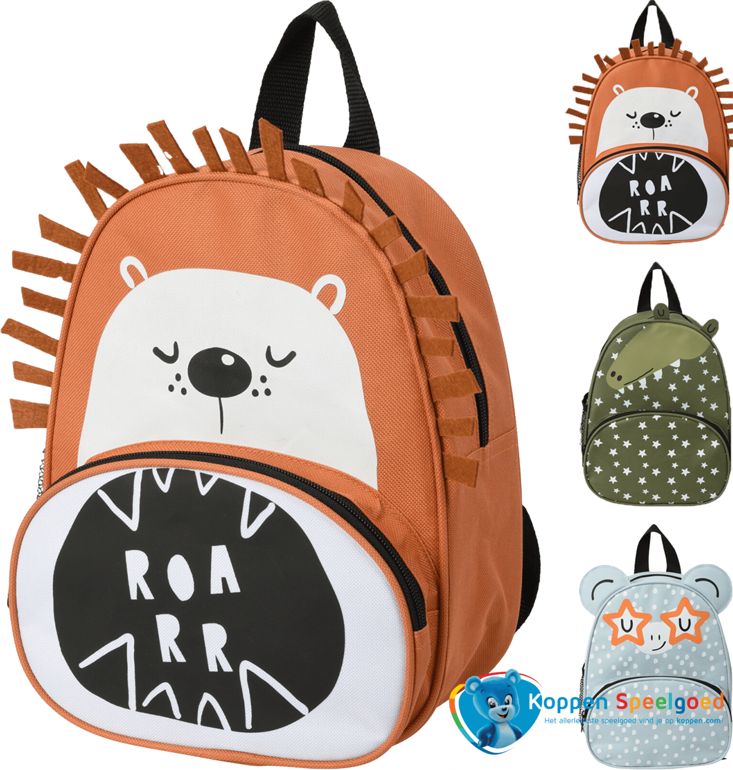 Een sterke kinderrugzak met voorzak in drie vrolijke verschillende dierenprints in diverse kleuren. Deze worden door elkaar geleverd. Prijs is per stuk.