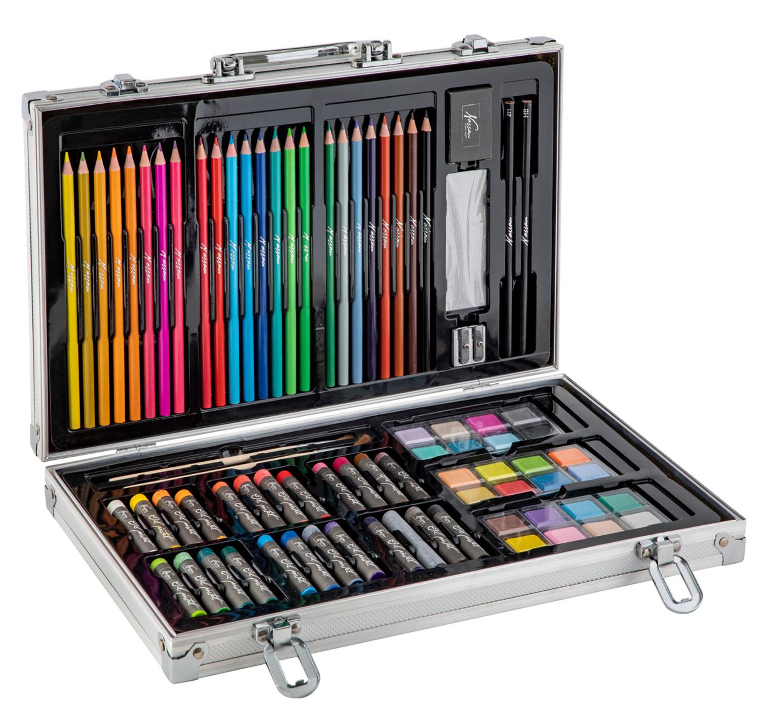 Met de Nassau Fine Art teken set laat je je creativiteit het voortouw nemen. De 79 delige tekenset bestaat o.a. uit kleurpotloden, waterverf en oliepastels zodat je de leukste technieken kunt samenbrengen. Houdt je tekenspullen overzichtelijk bij elkaar in de metalen koffer en neem ze eenvoudig mee op reis! Haal alles wat je nodig hebt nu in huis.