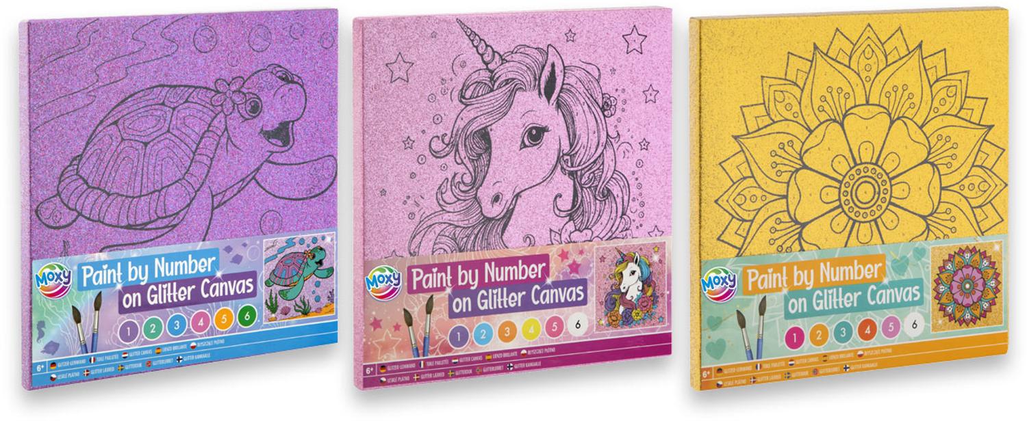 - Glitter canvas op nummer: Een genummerd canvas met een voorbedrukt patroon, zodat het schilderen eenvoudig en leuk is.