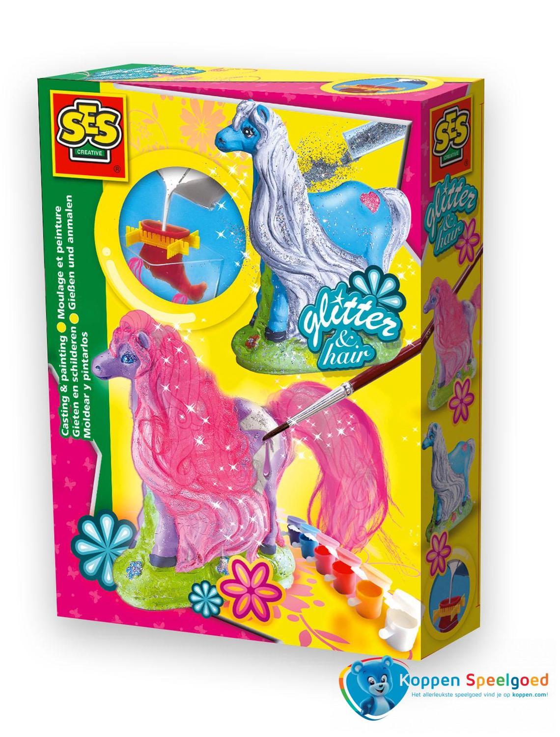 SES Gipsgieten paard met glitter en haar. Maak de mooiste beeldwerkjes van gips met SES Creative. Met deze set maak je een mooi paard van gips dat je vervolgens met de bijgeleverde verf beschildert. Het paard wordt nog mooier als je de echte manen erop plakt. In deze doos vind je een mal waarin je met gips een 3D paard kan gieten, het gips, verf in zes verschillende kleuren, glitters, de manen en een penseel.