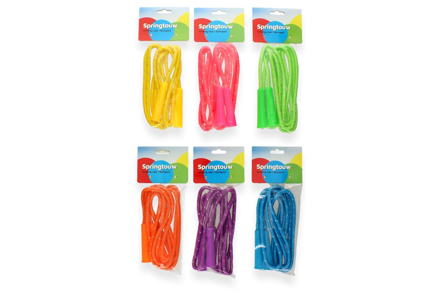 Springtouw in zakje. Het springtouw heeft een lengte van 210 cm. Het handvat is in dezelfde kleur als het springtouw.