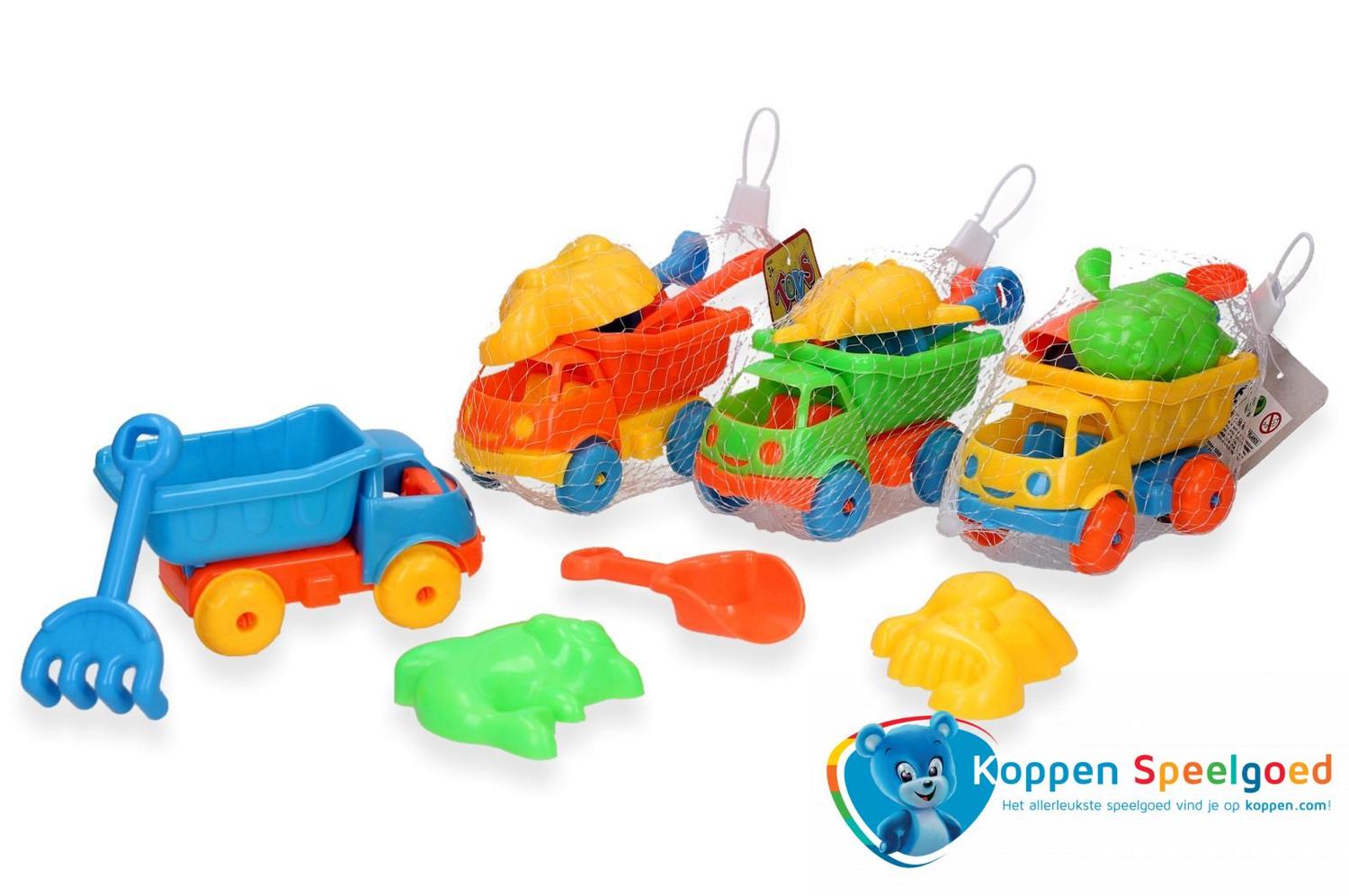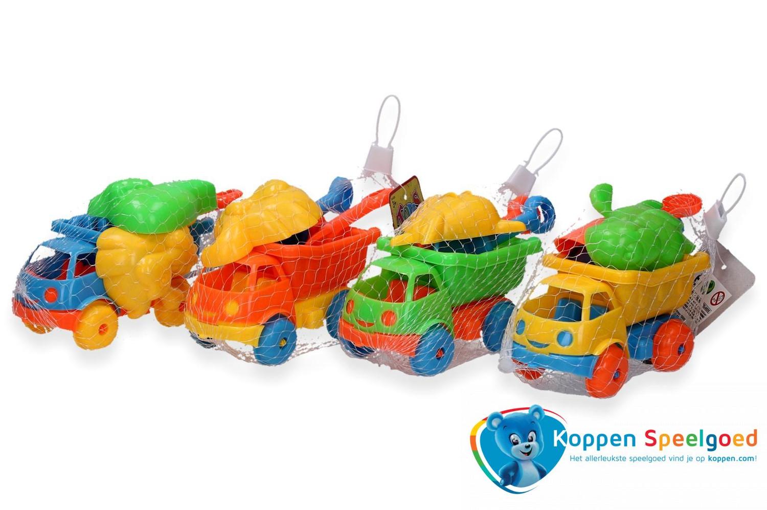 Strandauto met accessoires. Een leuk autootje voor op het strand. Bevat een vormpje en twee accessoires. De verschillende kleuren worden door elkaar geleverd. Leuk zomer speelgoed voor kinderen vanaf drie jaar.