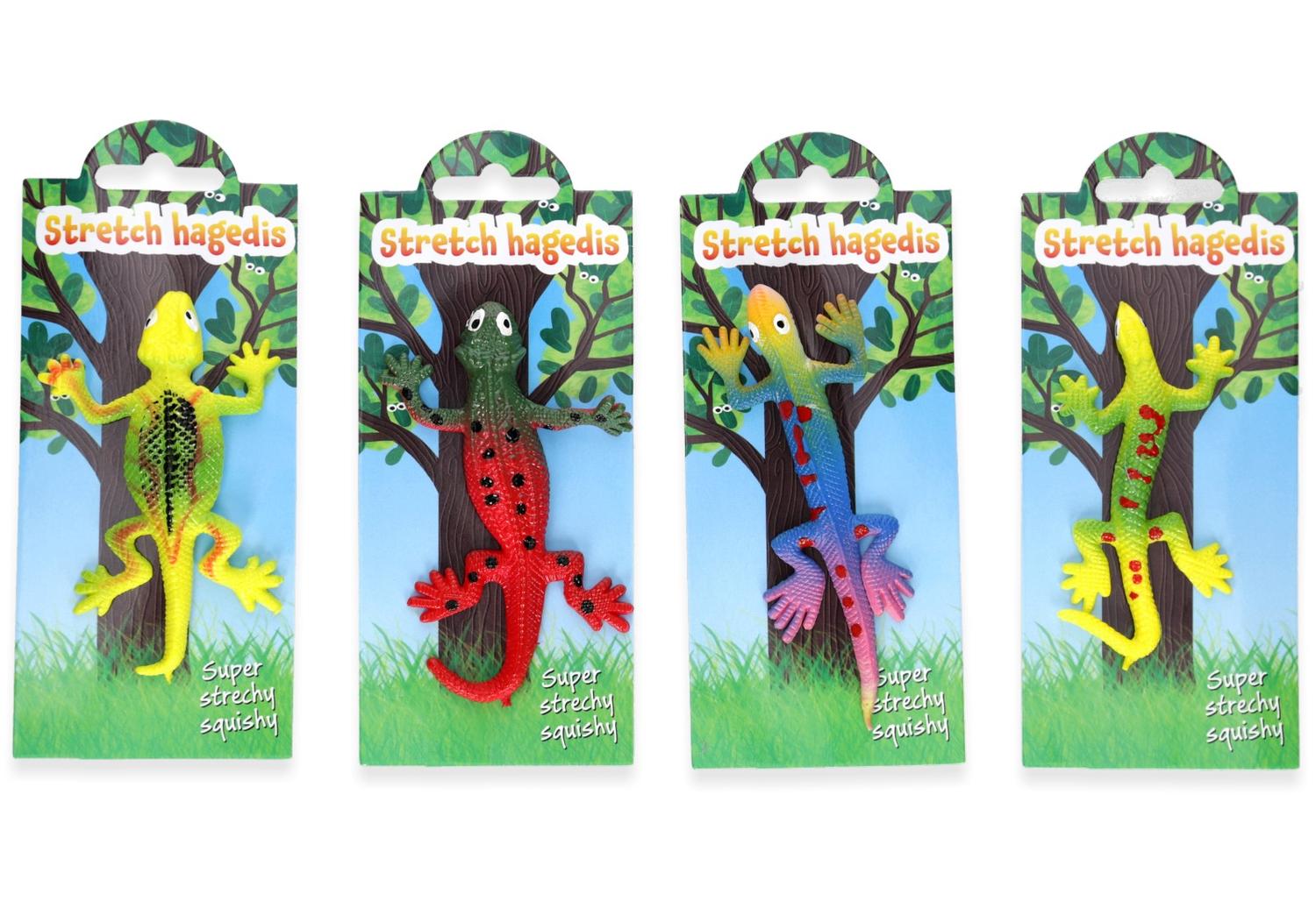 Stretch hagedis op kaart. Stretch de hagedis uit en schiet hem weg. Er zijn verschillende hagedissen en die worden door elkaar geleverd. Leuk cadeau voor in de grabbelton. Geschikt voor kinderen vanaf drie jaar.
