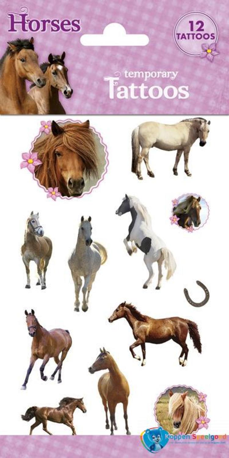 Vel met 12 tijdelijke tattoo-stickers van paarden. Lees goed de instructies achterop.