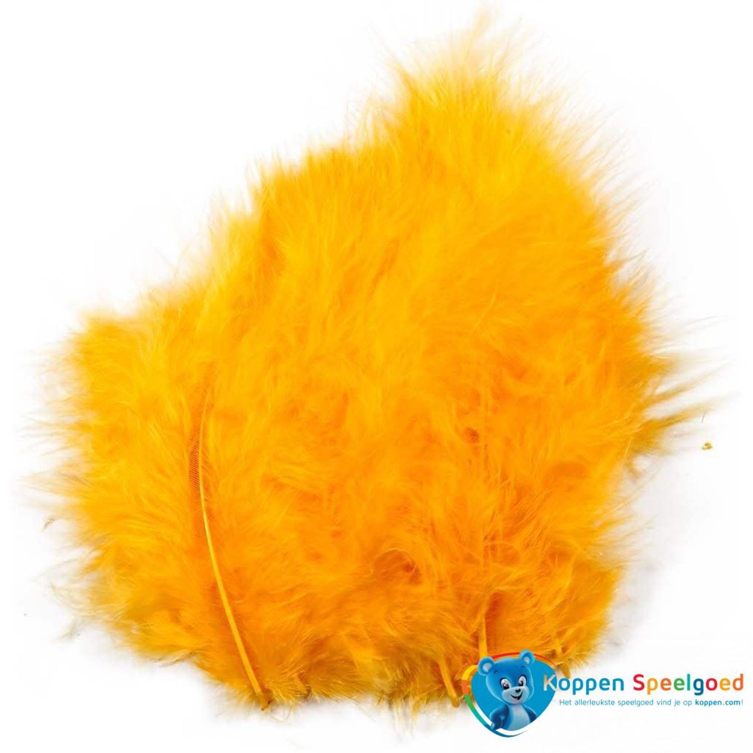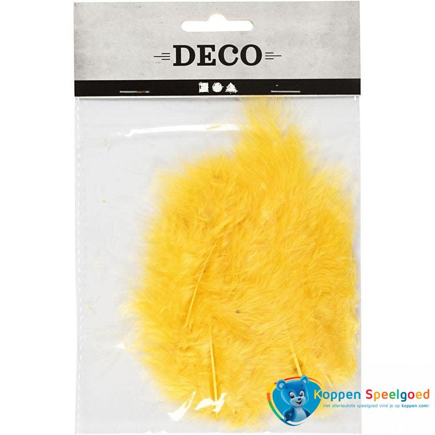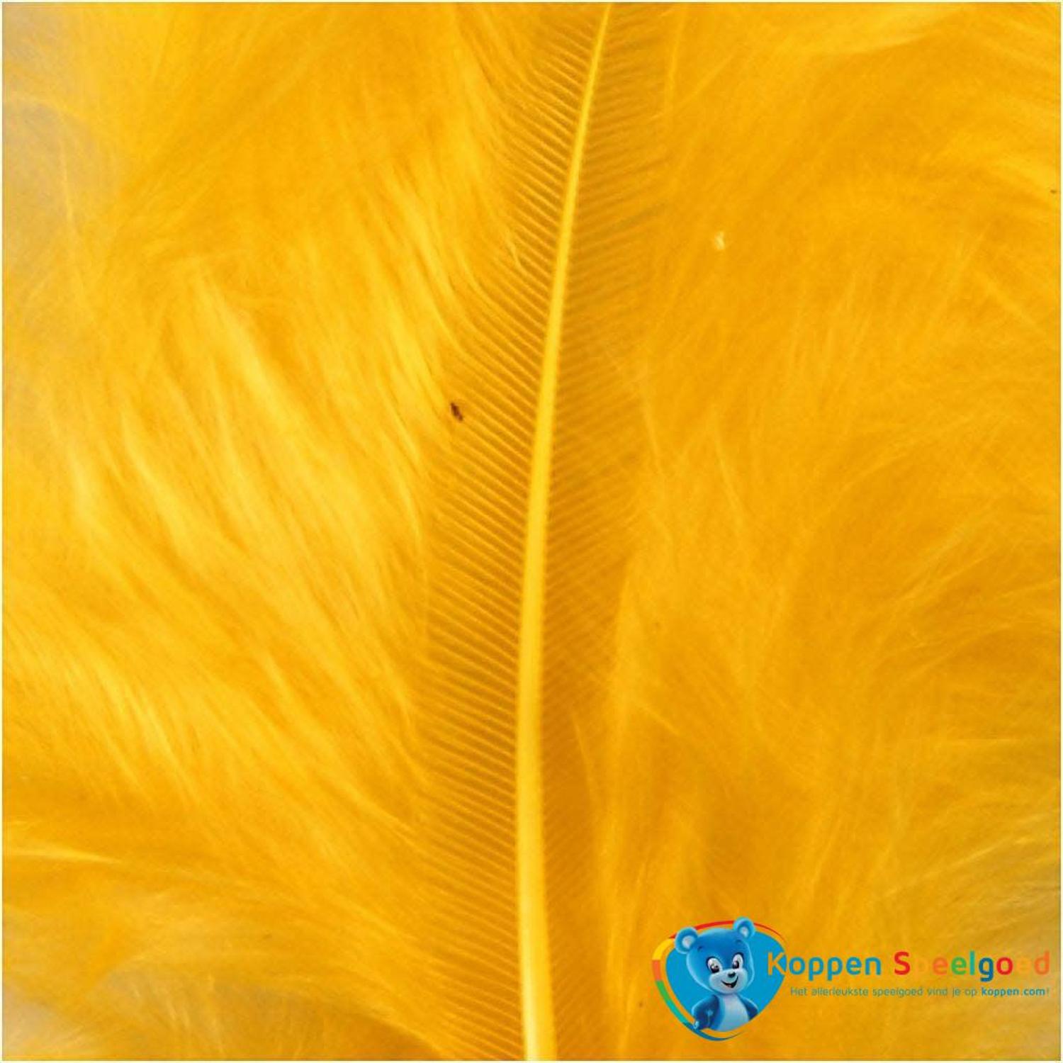 Een zakje met gele veren, 15 stuks in het zakje. De veren zijn in de lengte van 5 tot 12 cm.