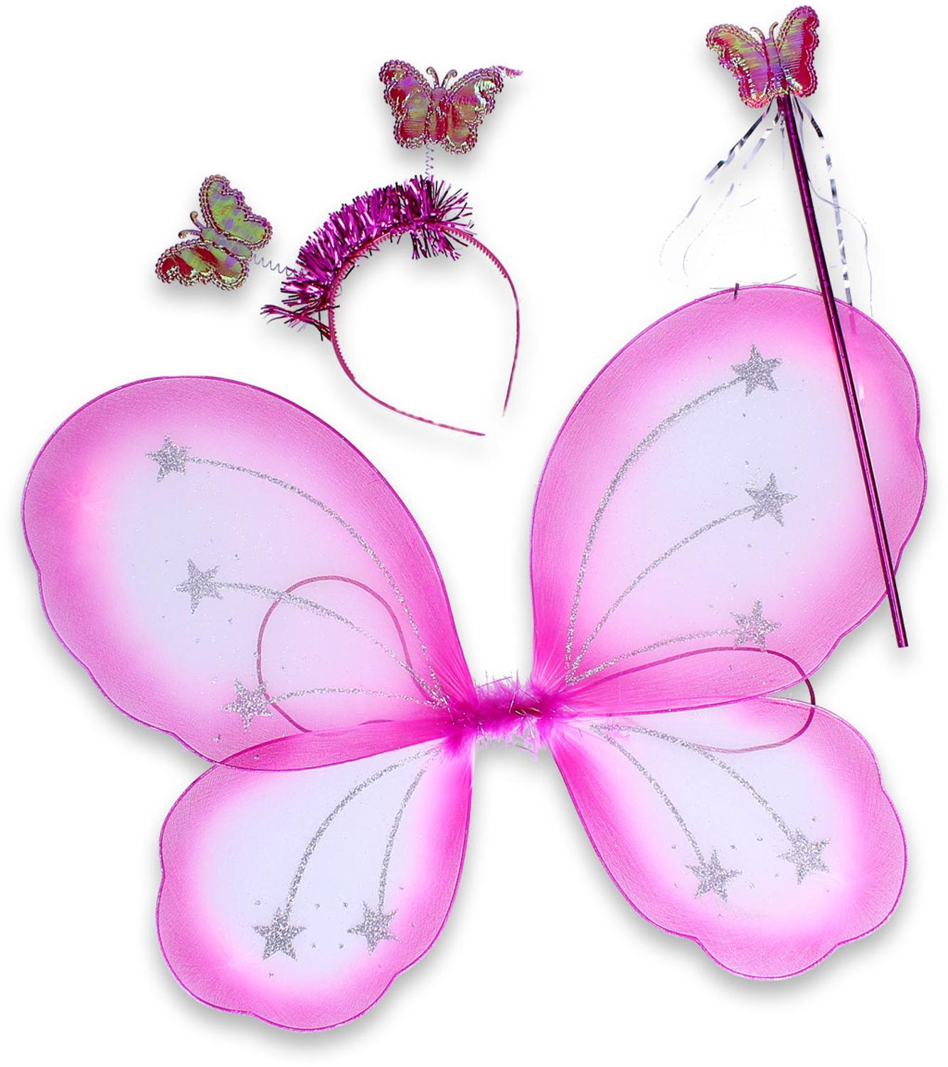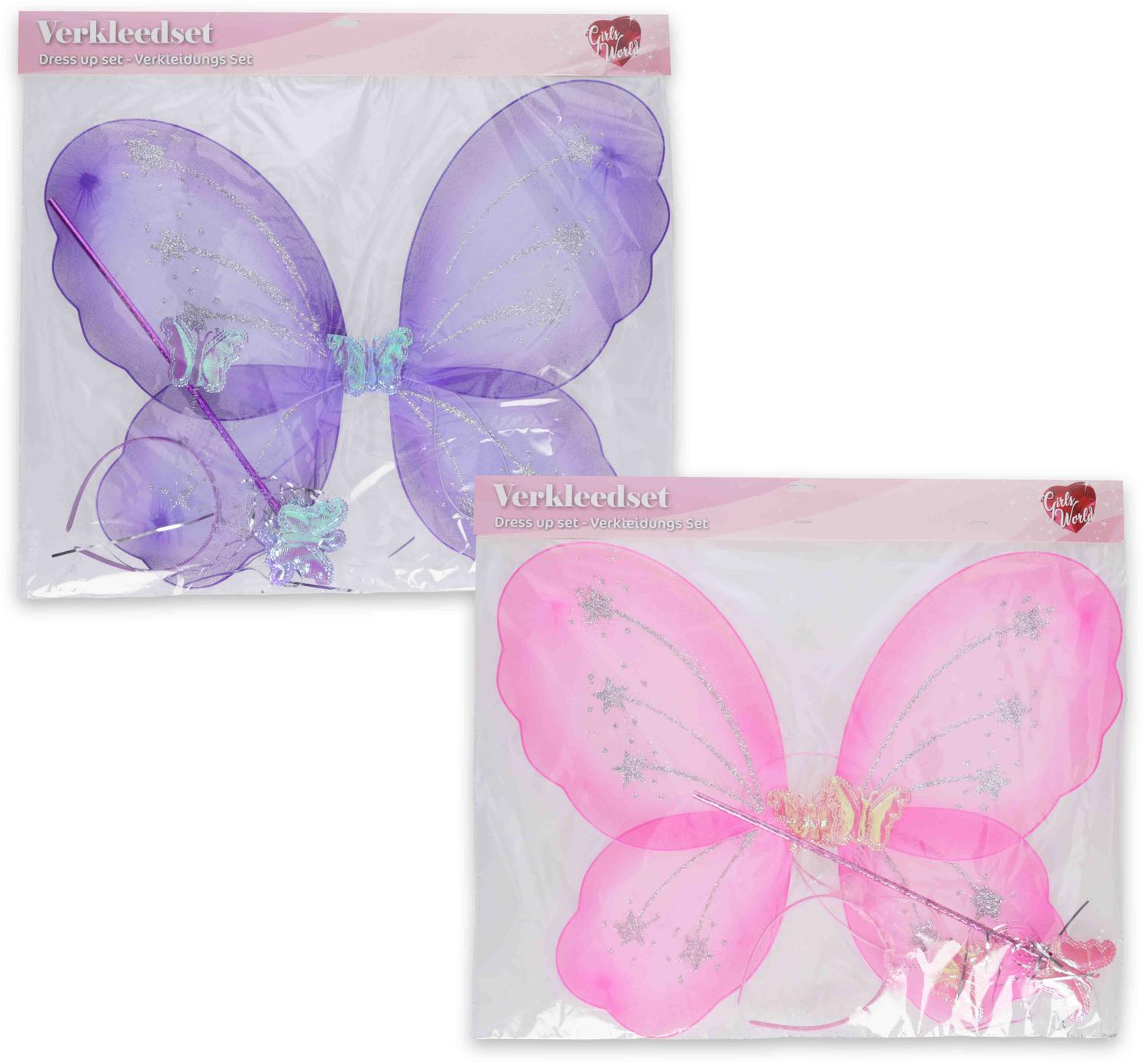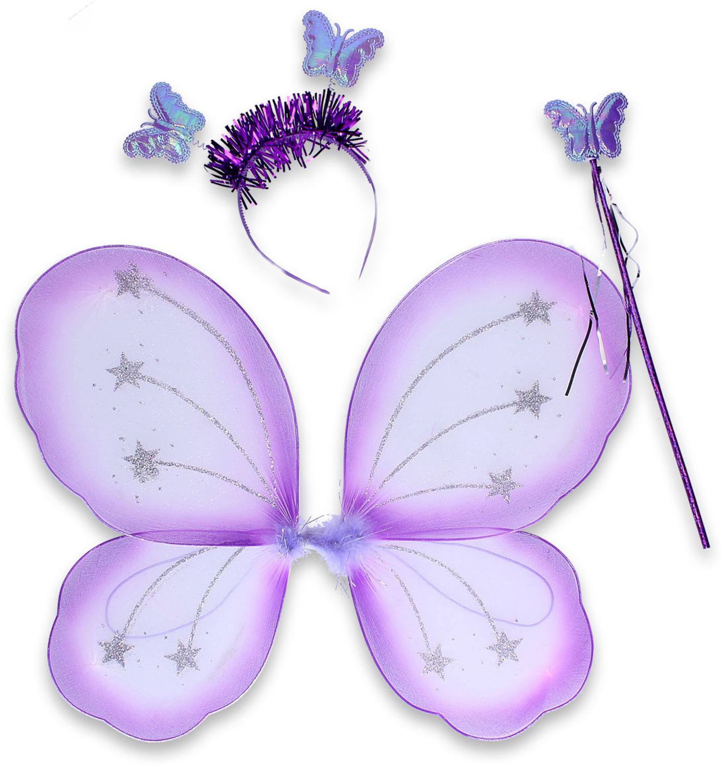 Een set bestaande uit een vlindervleugel, stafje en een diadeem. Leuk om te verkleden voor een verkleedpartijtje. Er zijn verschillende kleuren, deze worden willekeurig door elkaar geleverd. De prijs is per stuk.