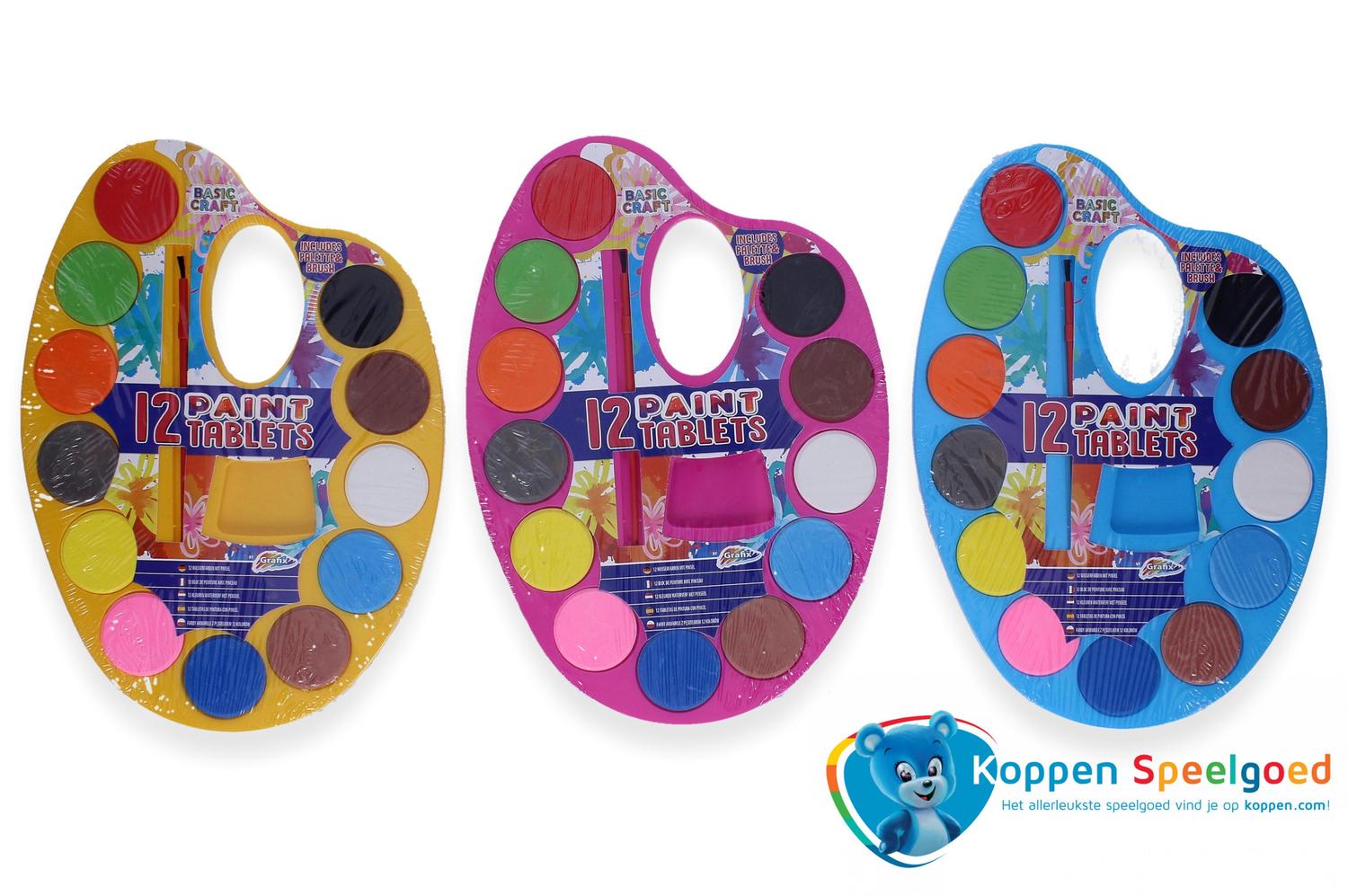 Dat is handig: dit palet kun je vasthouden met een hand tijdens het schilderen. Er zijn twaalf verschillend gekleurde schijven waterverf op aangebracht. Er is een vakje om een klein beetje water in te doen of verf in te mengen. En er zit een penseel bij. Er zijn meerdere varianten: het materiaal van het palet verschilt van kleur, deze worden door elkaar geleverd. De 12 kleuren van de verf zijn wel altijd hetzelfde.